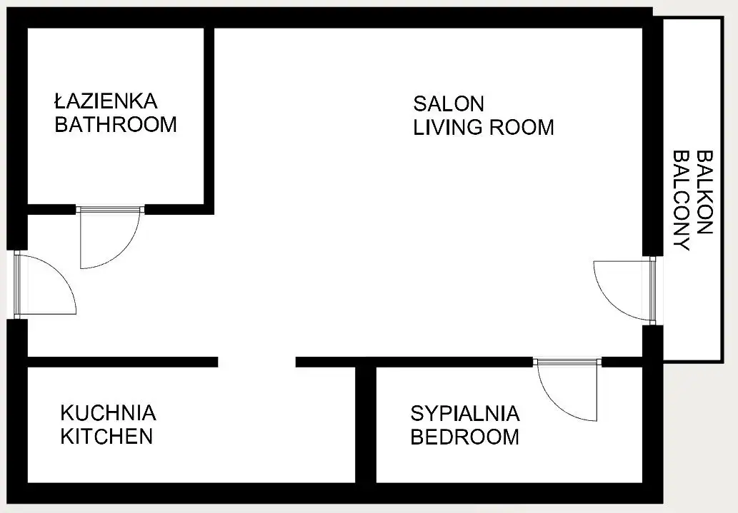 Pokoje: Sypialnia, salon, otwarta kuchnia, przedpokój, łazienka, balkon.