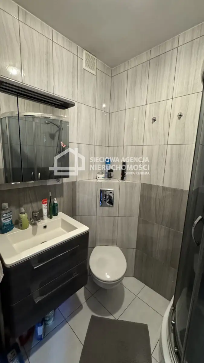 W skład mieszkania wchodzi: pokój z aneksem kuchennym, sypialnia, łazienka z kabiną prysznicową i WC oraz przedpokój z zabudową.