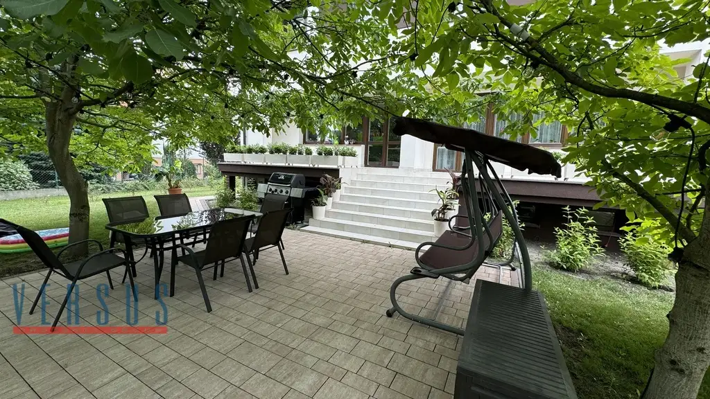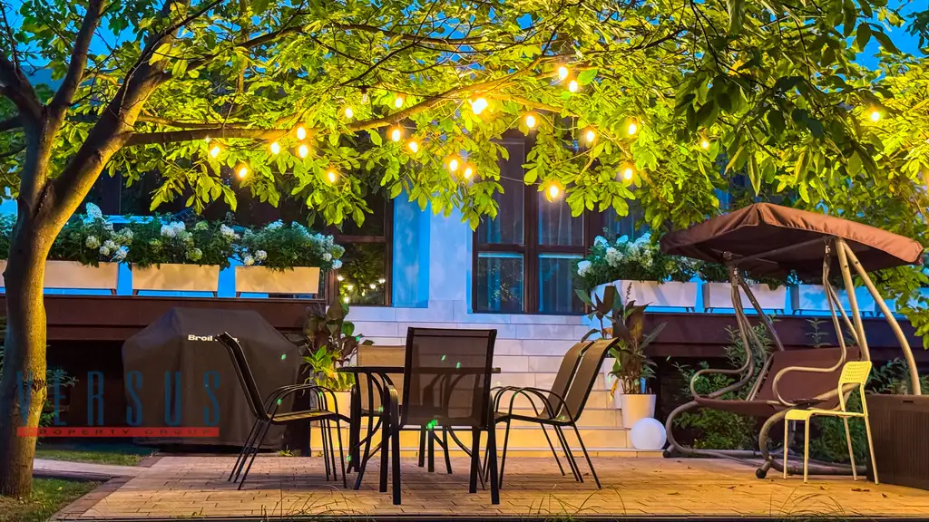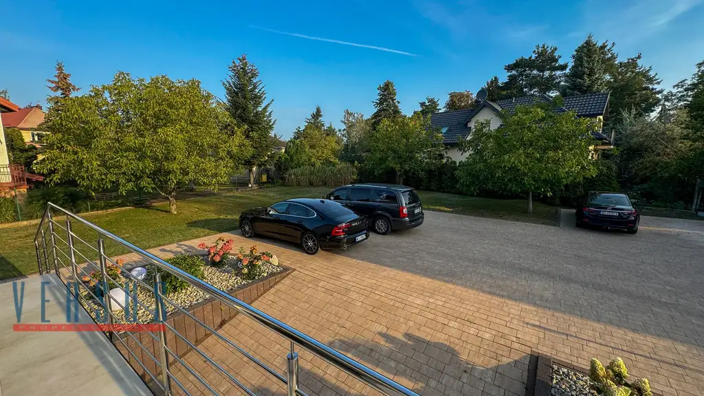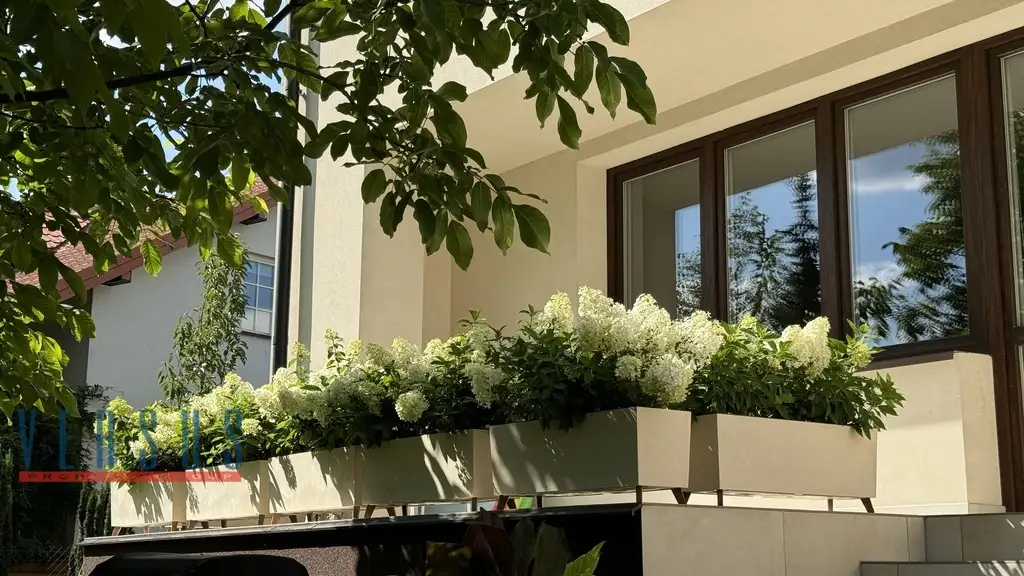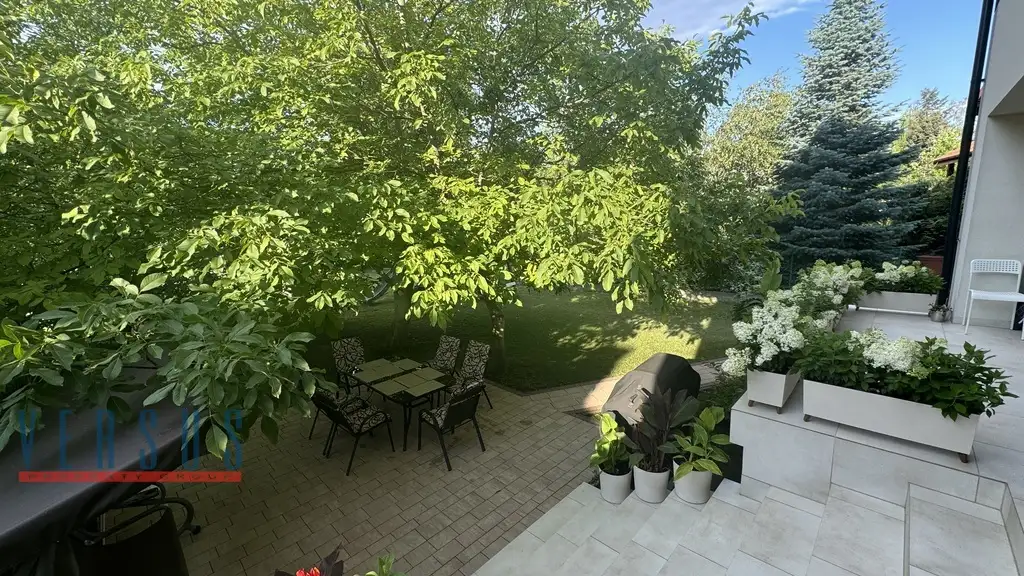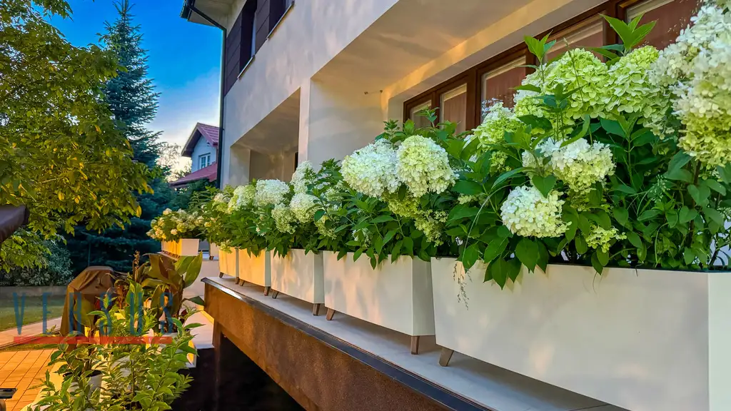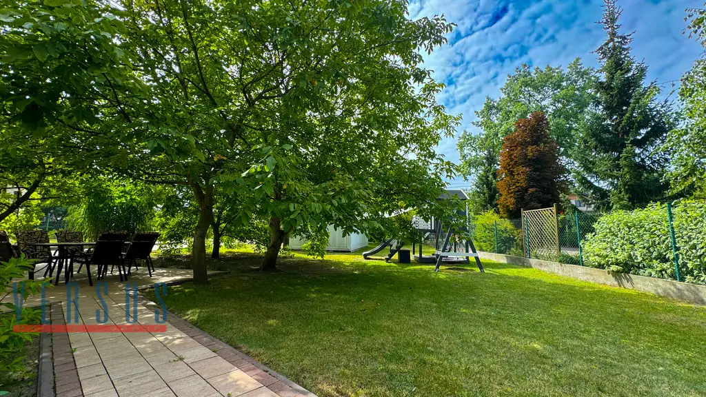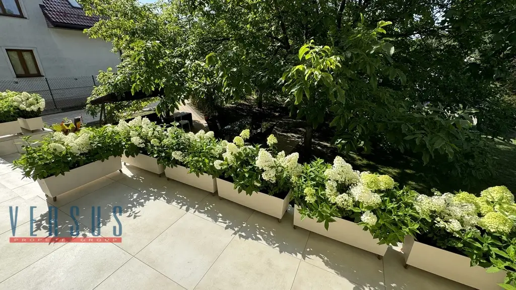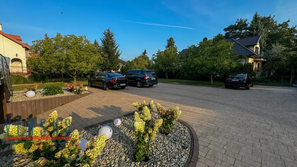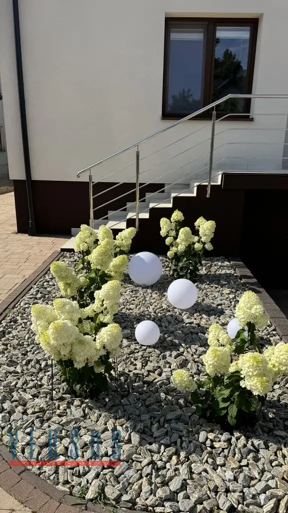 Ogród zagospodarowany, drzewa - orzech włoski (10 szt.) co daje w okresie letnim wspaniały klimat i dużo chłodu, poza tym nasadzenia traw - wysokość do 2,5 m, krzewy Krzewuszka pospolita, maliny jagoda kamczacka oraz hortensje w tym 48 hortensji bukietowych w donicach na tarasach. Liczne oświetleni led posesji przy wjeździe na na tyłach domu.