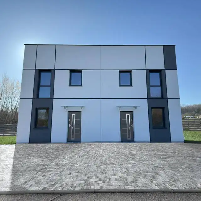 Budynek w pełni wykończony z zewnątrz, z oknami, drzwiami i doprowadzonymi mediami.