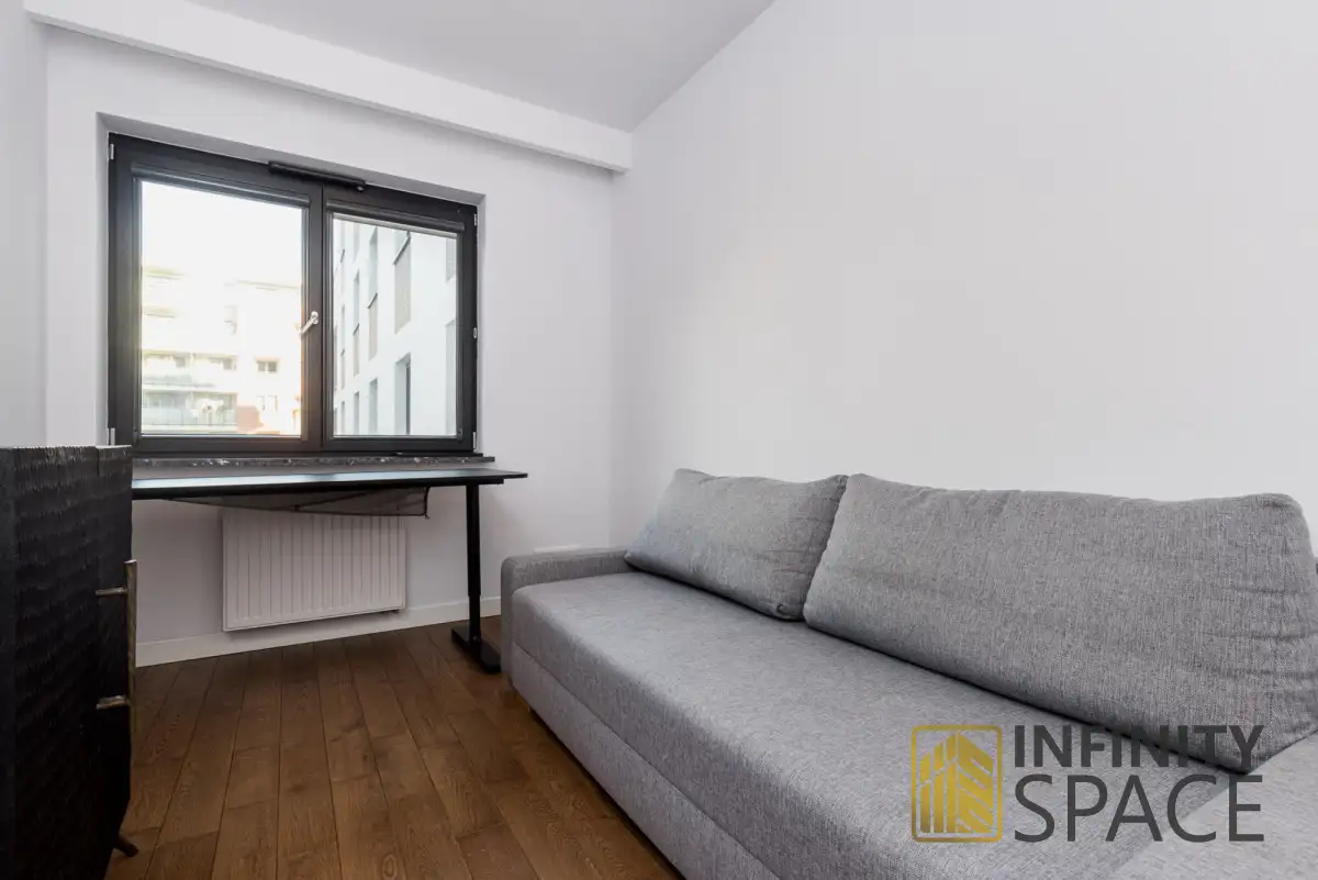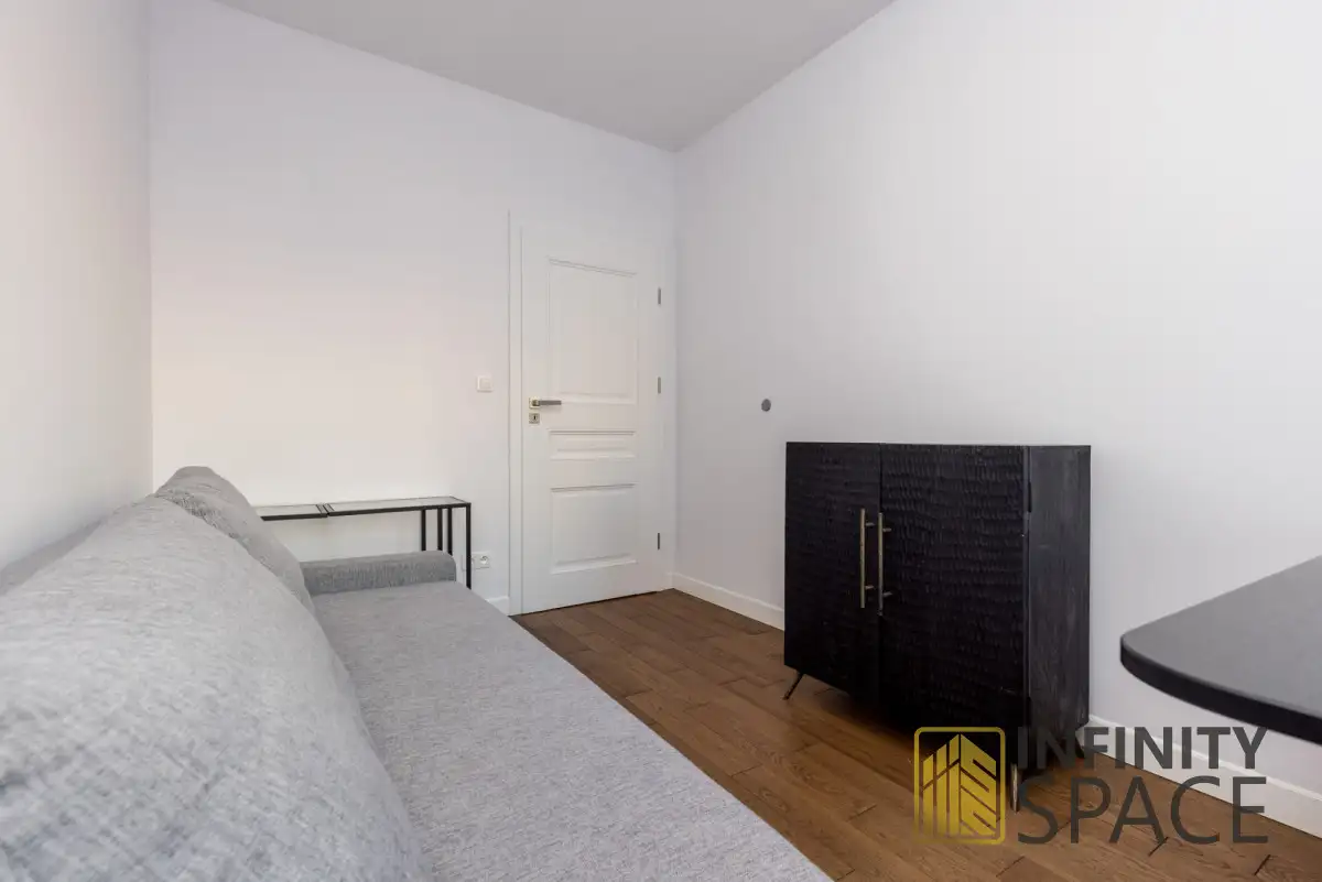 - mniejszym pokojem z rozkładaną sofą, biurkiem i komodą,