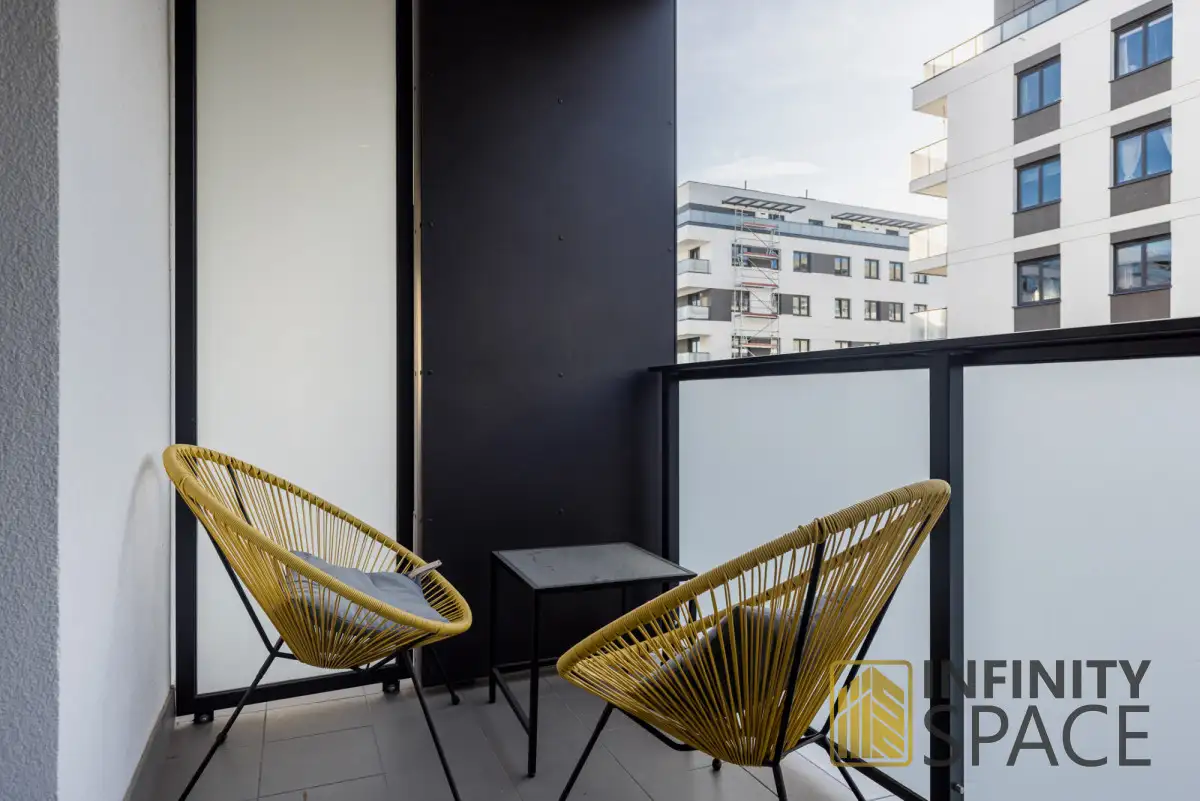 mieszkania przynależy balkon z zestawem mebli ogrodowych.