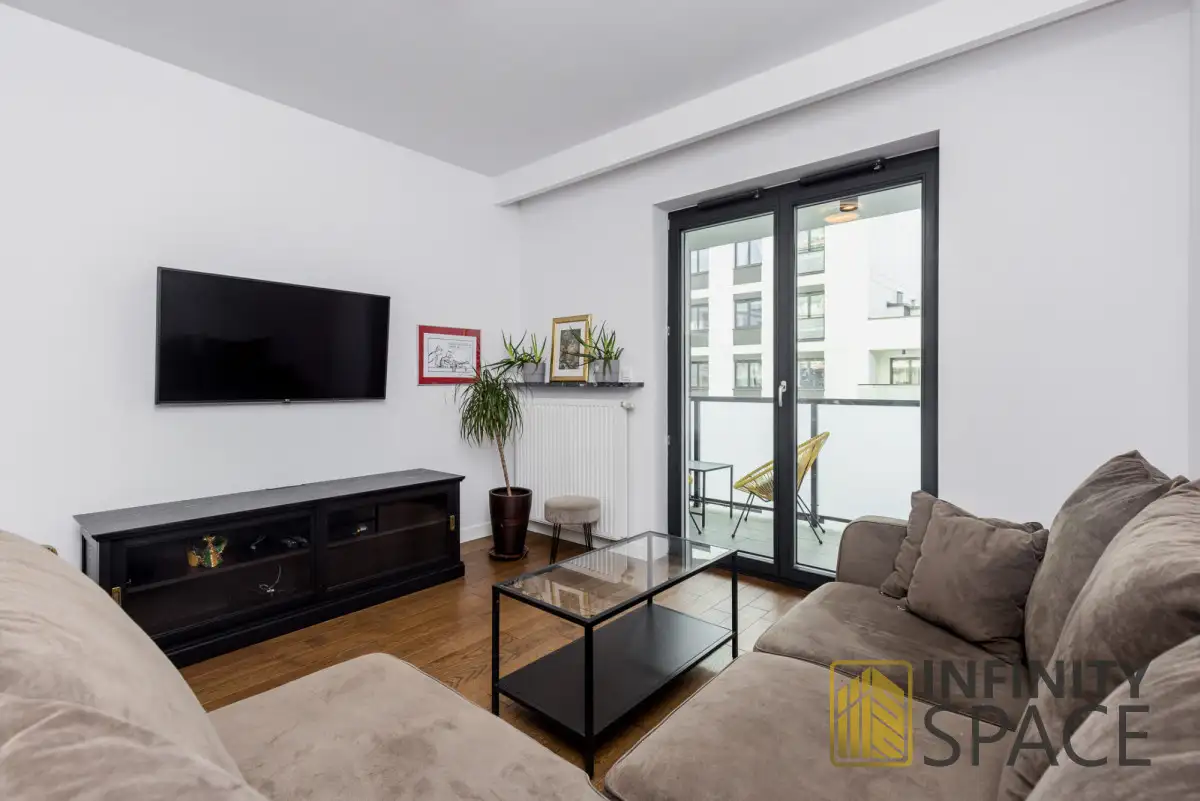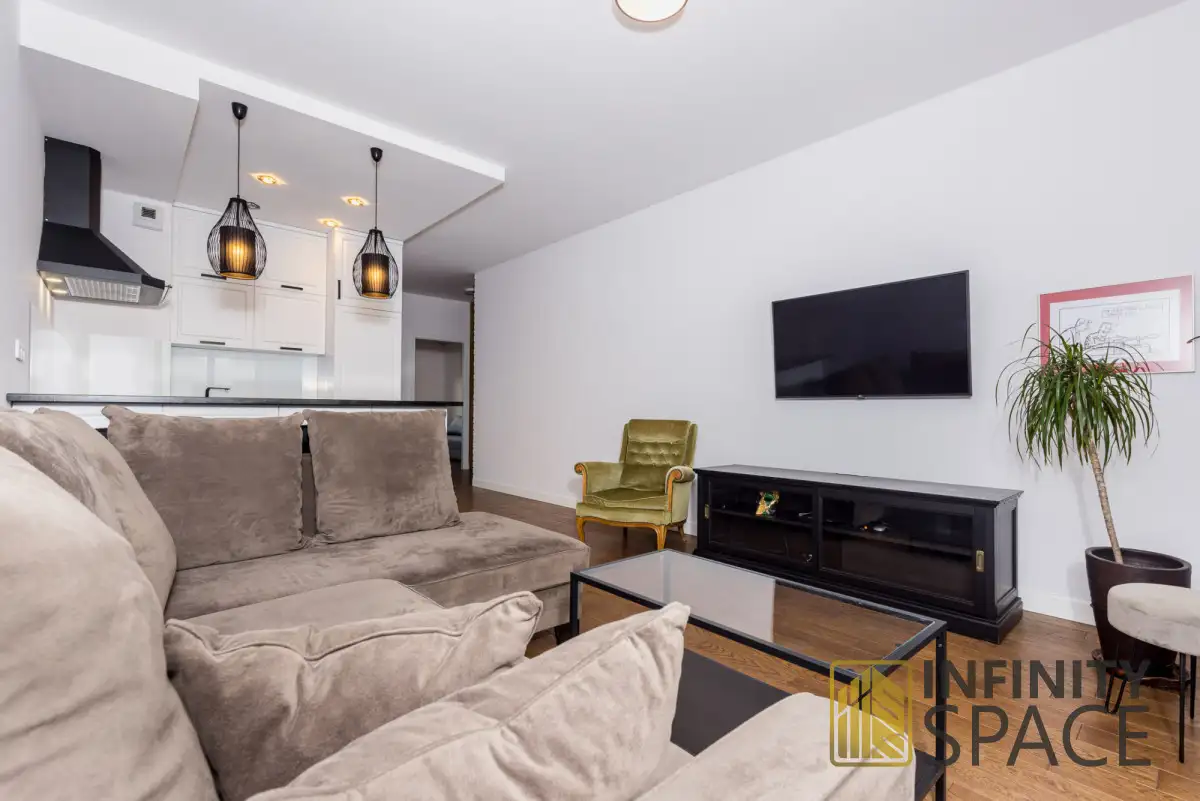 - przestrzenny salon z wygodnym i rozkładanym narożnikiem i strefą TV, z wyjściem na balkon,