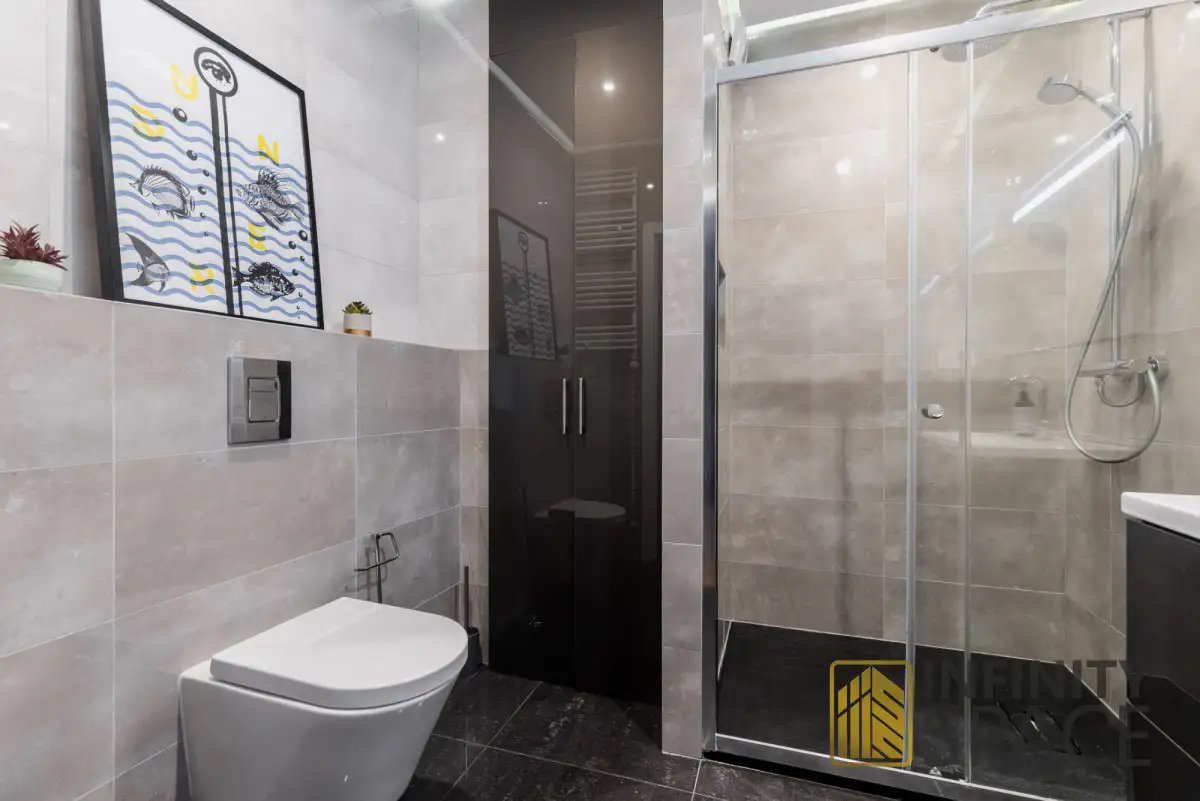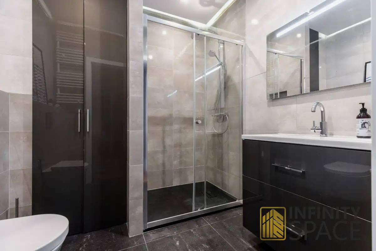 - łazienki z prysznicem i miejscem do przechowywania asortymentu,
