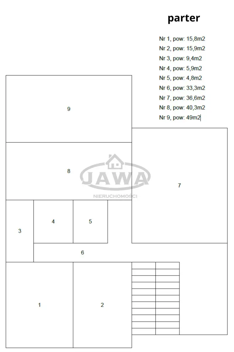 8 - pomieszczenie obecnie składające się z trzech pomieszczeń - toaleta/magazynek(12m²), salka bez okien z przejściem do pomieszczenia nr 9.