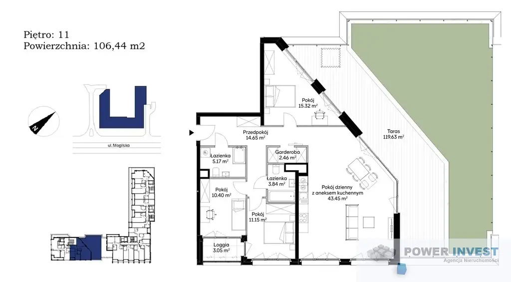 Oferowane mieszkanie znajduje się na 11 piętrze. Lokal ma powierzchnię 106,44 m² powierzchni użytkowej i składa się z: