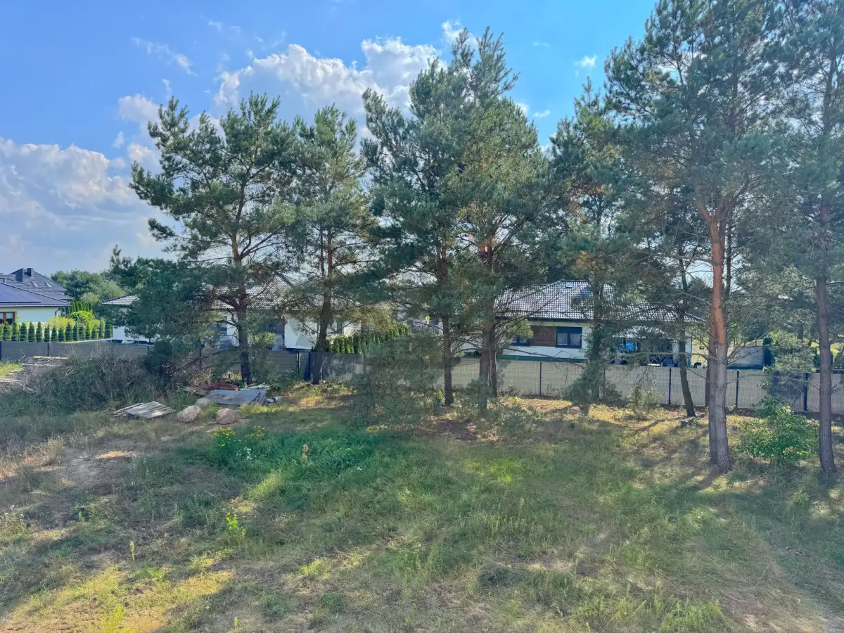 Działka o powierzchni 558m², duży ogród za domem do zagospodarowania z pięknymi dużymi sosnami.
