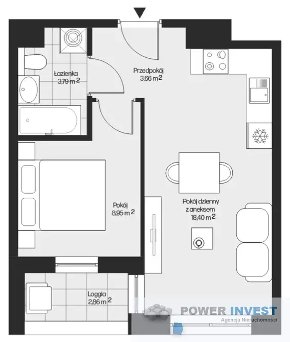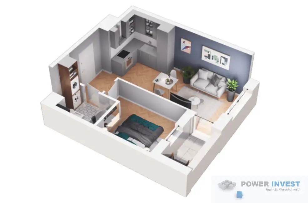 Zlokalizowana na 2 piętrze. Budynek posiada 9 pięter. Mieszkanie o powierzchni 34.8m² tworzą: