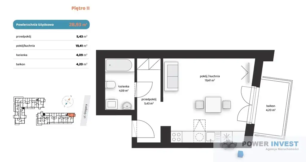 Mieszkanie znajduje się na 2 pietrze. Lokal ma powierzchnię 28,93 m² i składa się z: