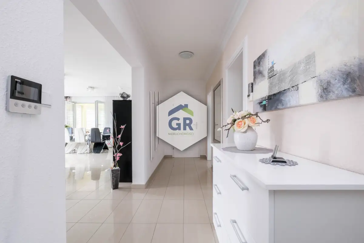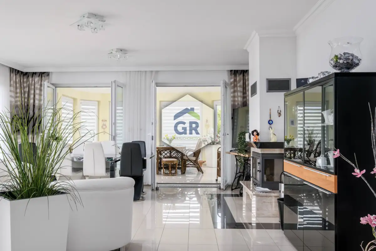 na działce o powierzchni 1232 m². Nieruchomość jest gotowa do zamieszkania, wykończona w podwyższonym standardzie w nowoczesnym stylu.
