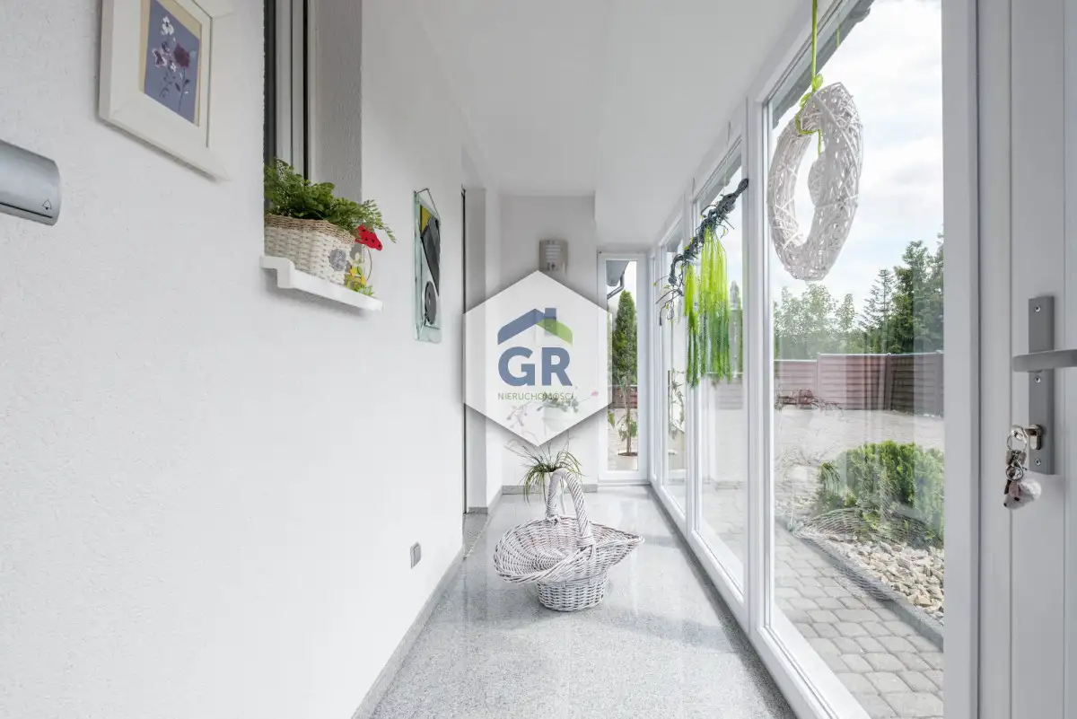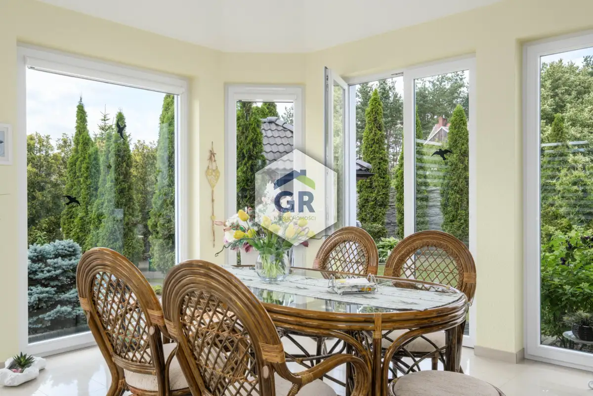 Dużym atutem parteru jest ogród zimowy (22,09 m²), który został zaadaptowany z tarasu. Pomieszczenie dzięki wysokim witrynom jest doskonale doświetlone. Z ogrodu zimowego poprzez drzwi tarasowe wychodzimy na ogród, który jest bardzo zadbany, a roślinność została w nim zaaranżowana w przemyślany sposób, tak aby zachować pełną prywatność. W ogrodzie przewidziano miejsce wypoczynku, znajduje się w nim również drewniana altana oraz drewniany budynek gospodarczy.