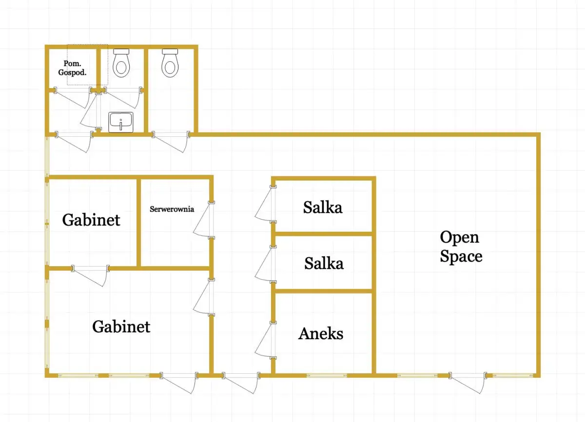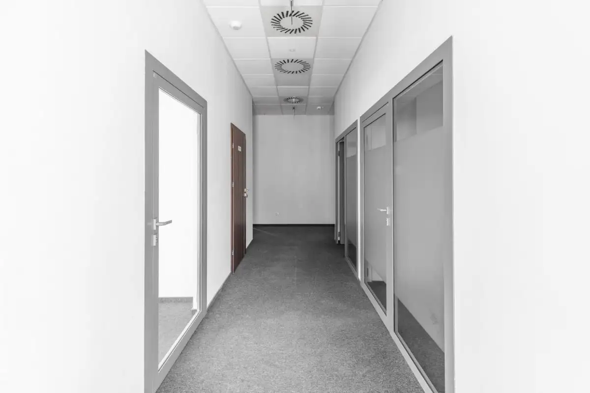- 3 pokoje biurowe: 12 m², 30 m², 57 m² (open space)