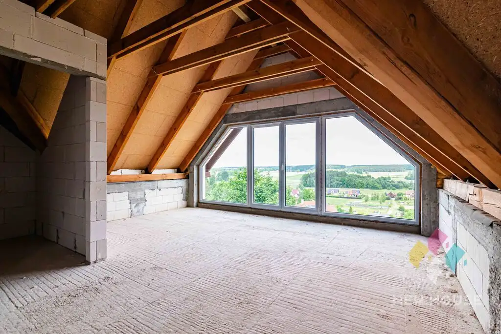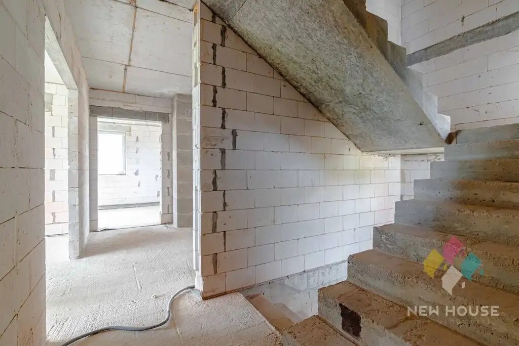 Dom w stanie surowym zamkniętym – wykonane ściany, dach, zamontowane okna i drzwi zewnętrzne. Budynek jest już zamknięty i zabezpieczony przed warunkami atmosferycznymi. Do wykończenia pozostały instalacje wewnętrzne, tynki, posadzki, ocieplenie poddasza i prace wykończeniowe. Idealna baza do realizacji własnej aranżacji wnętrz.