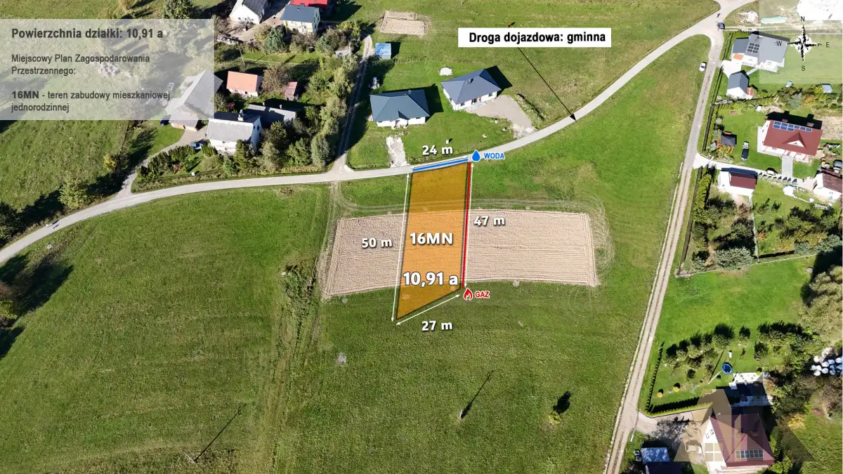 Działka - 10,91 ar - ma prostokątny kształt, jest lekko nachylona i dobrze nasłoneczniona. Teren nieogrodzony z bezpośrednim dostępem do drogi (forma prawna drogi dojazdowej - gminna). W pobliżu znajduje się zabudowa jednorodzinna i tereny zielone. Nieruchomość jest wolna od wszelkich obciążeń, praw, ograniczeń i roszczeń.