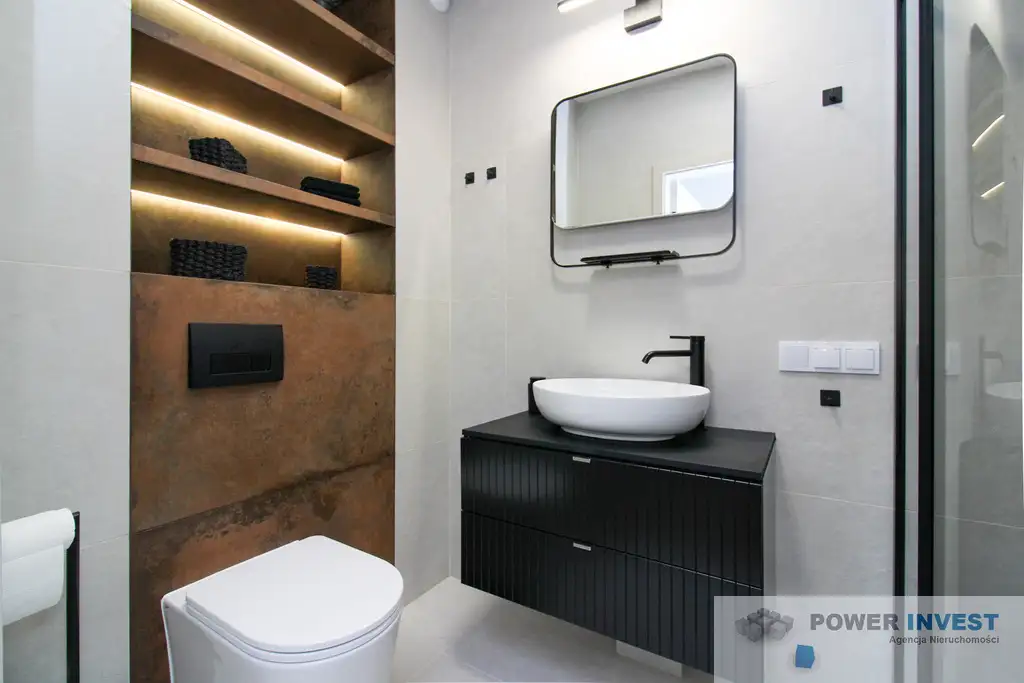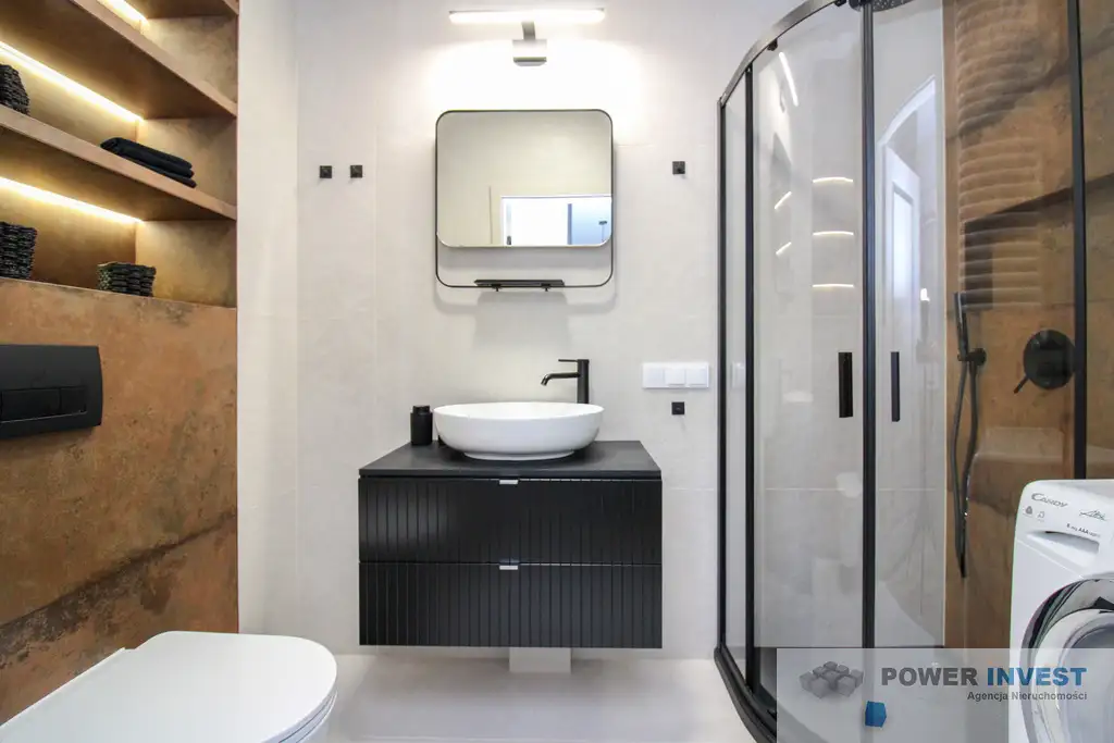 Łazienka: pralko–suszarka, kabina prysznicowa, nowoczesne wykończenie