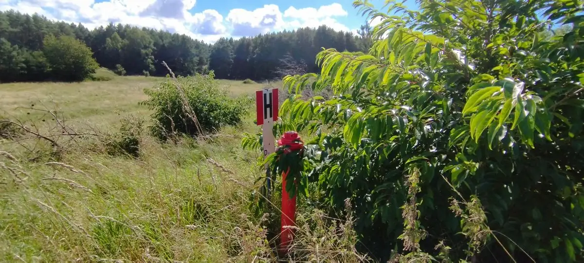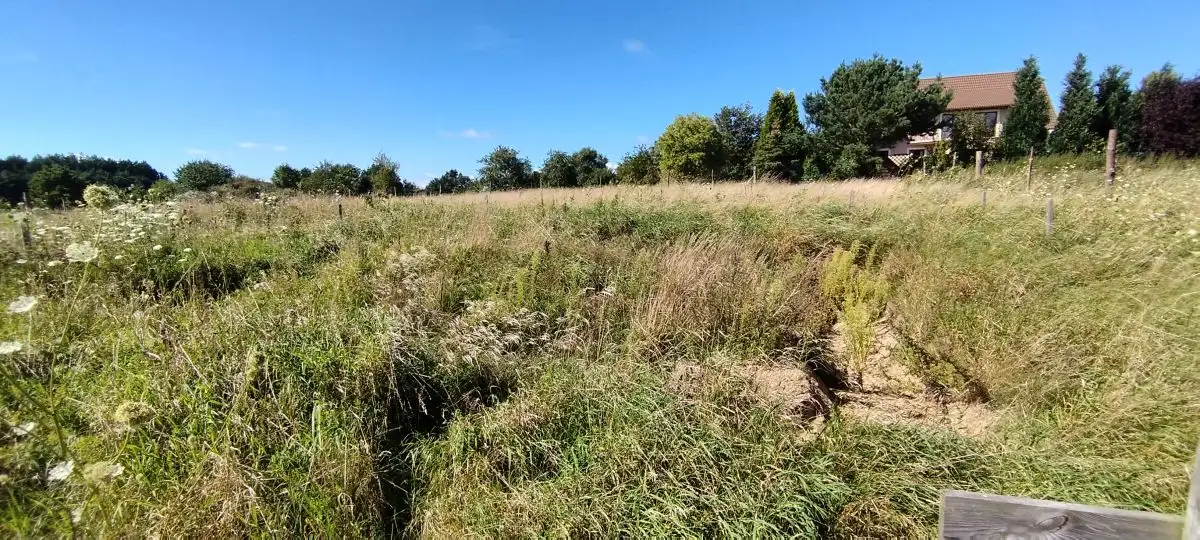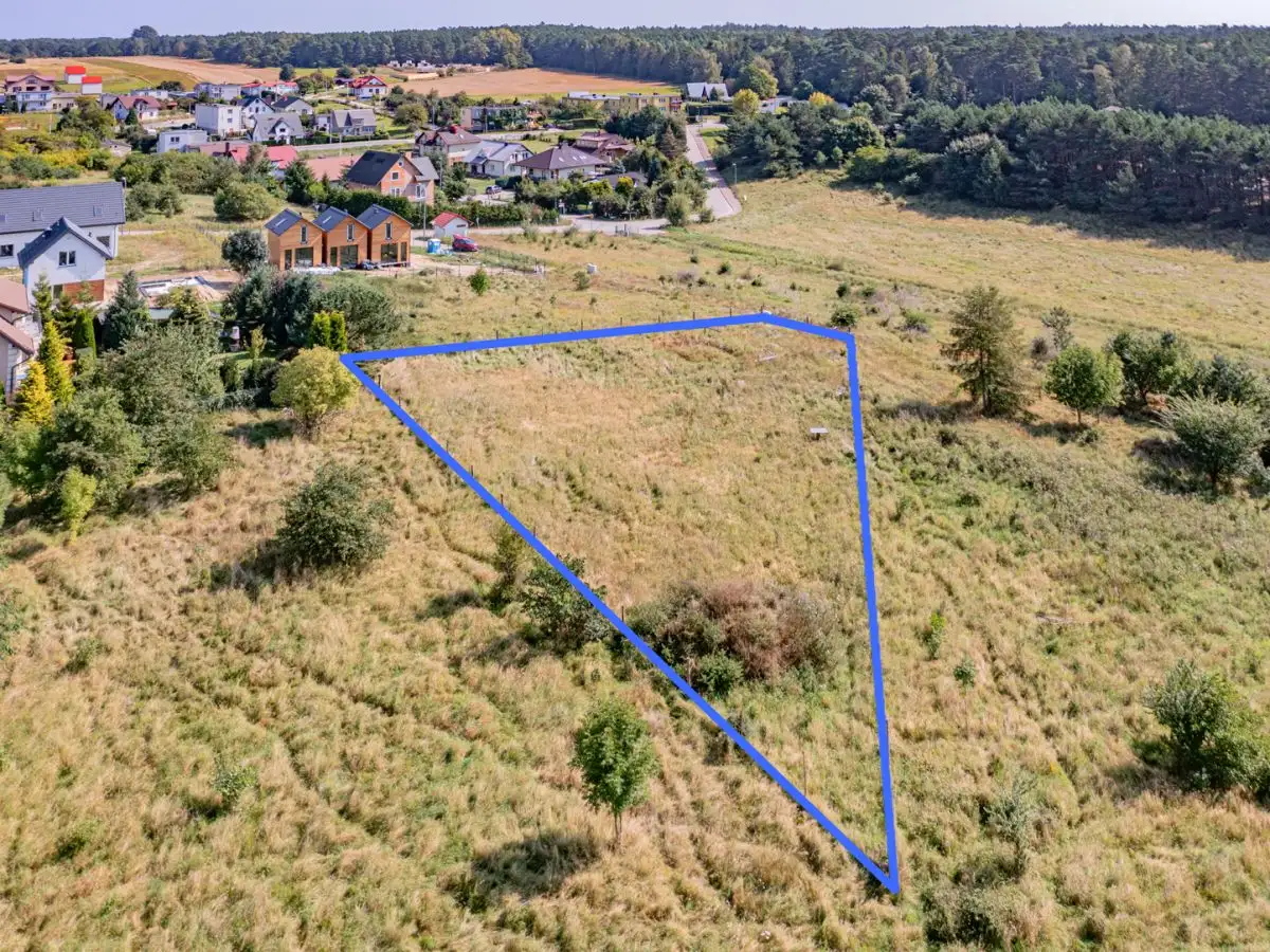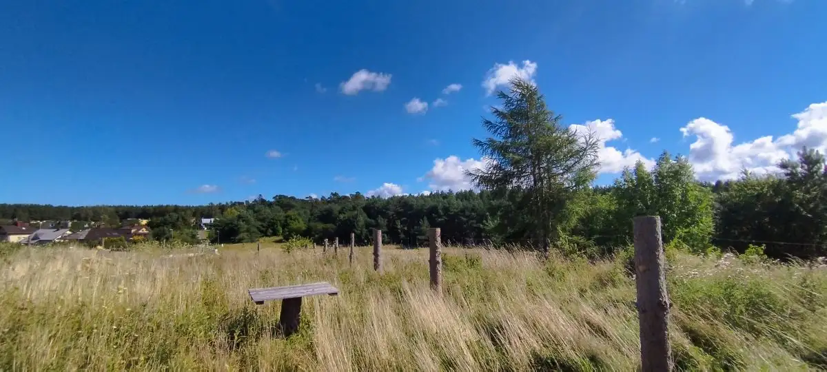 Z działki rozpościera się wspaniały widok na las i okolice, działka z lekkim nachyleniem, ogrodzona siatką budowlaną.