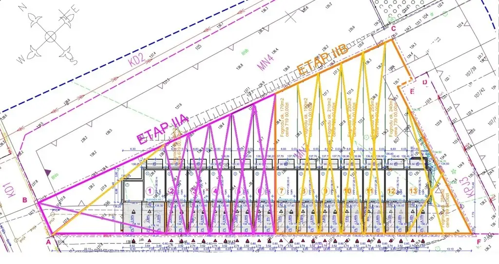 Etap Drugi Osiedla Na Wzgórzu polega na wybudowaniu 13 budynków jednorodzinnych mieszkalnych w zabudowie szeregowej od nr 1 do nr 13, każdy z budynków położony na odrębnej działce, o różnej powierzchni działek.