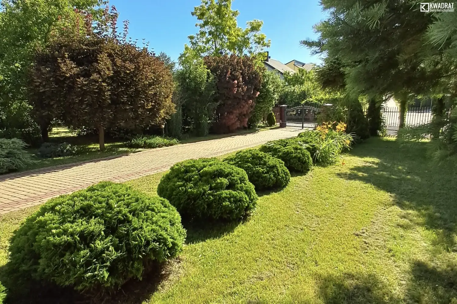 Działka o powierzchni 2115 m² została starannie zagospodarowana - znajdziemy tu krzewy, drzewa, a także podjazdy wykonane z kostki brukowej. Całość jest ogrodzona, z bramą wjazdową na pilota. Na działce znajduje się również budynek gospodarczy o powierzchni 57 m².
