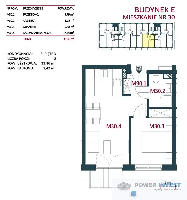 Nieruchomość znajduje się na 3 piętrze, ma powierzchnię 33,86 m² i składa się z:
