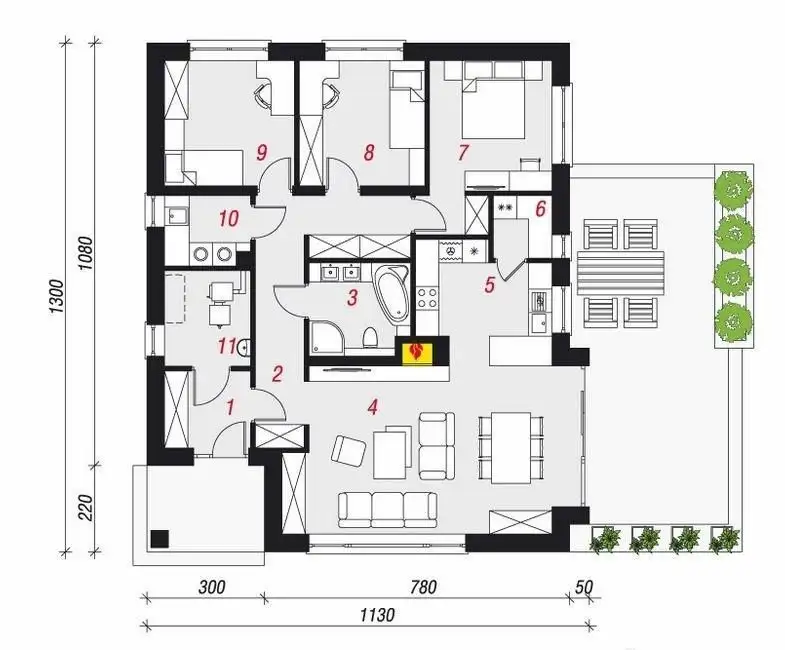 Prosta i tradycyjna bryła, przestronne, jasne wnętrza, salon z kominkiem i tarasem.