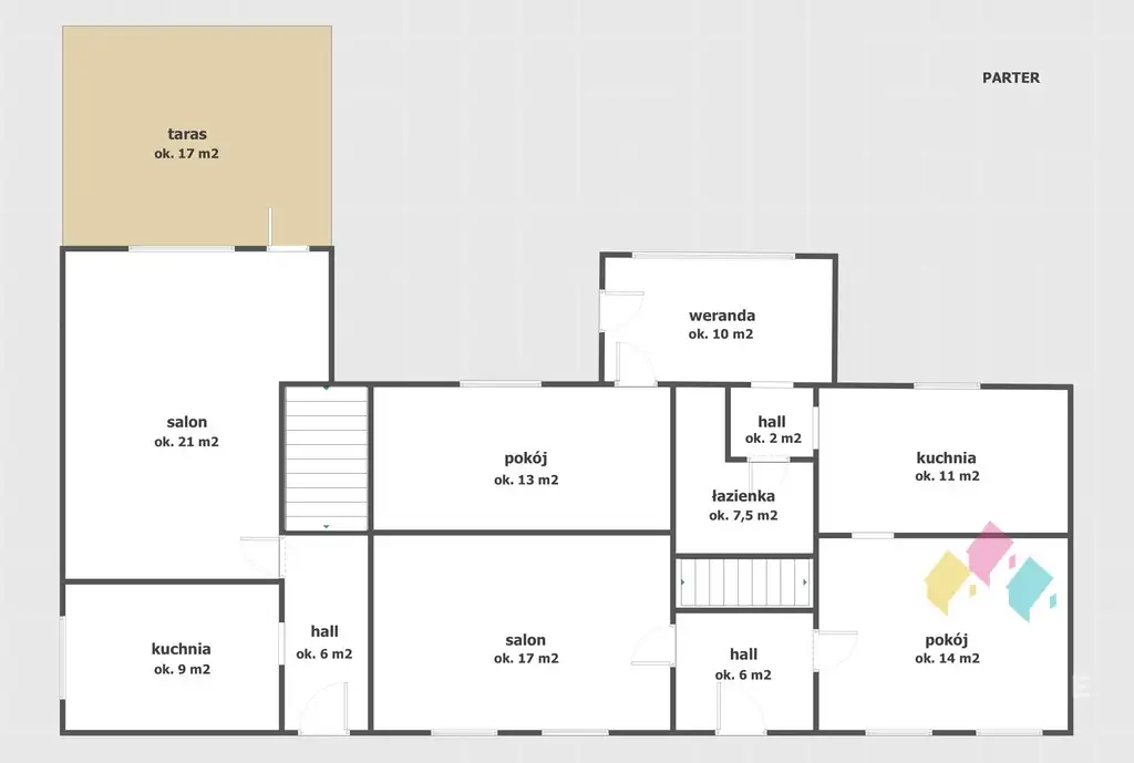 - hall 6 m², kuchnia 9 m², salon 21 m² z wyjściem na taras 17 m²