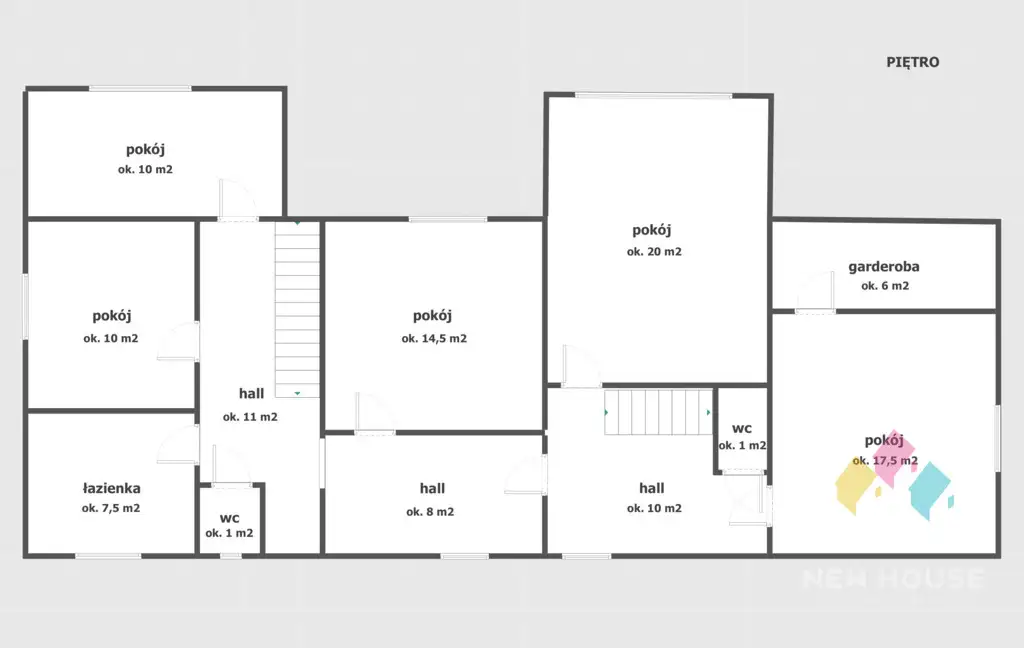 - hall 10 m², wc 1m², pokój 17,5 m² z garderobą 6 m², pokój 20 m², pokój 14,5 m², hall 8m 2 z możliwością przejścia do drugiej części domu