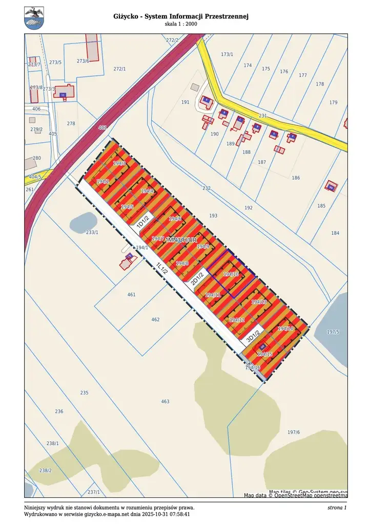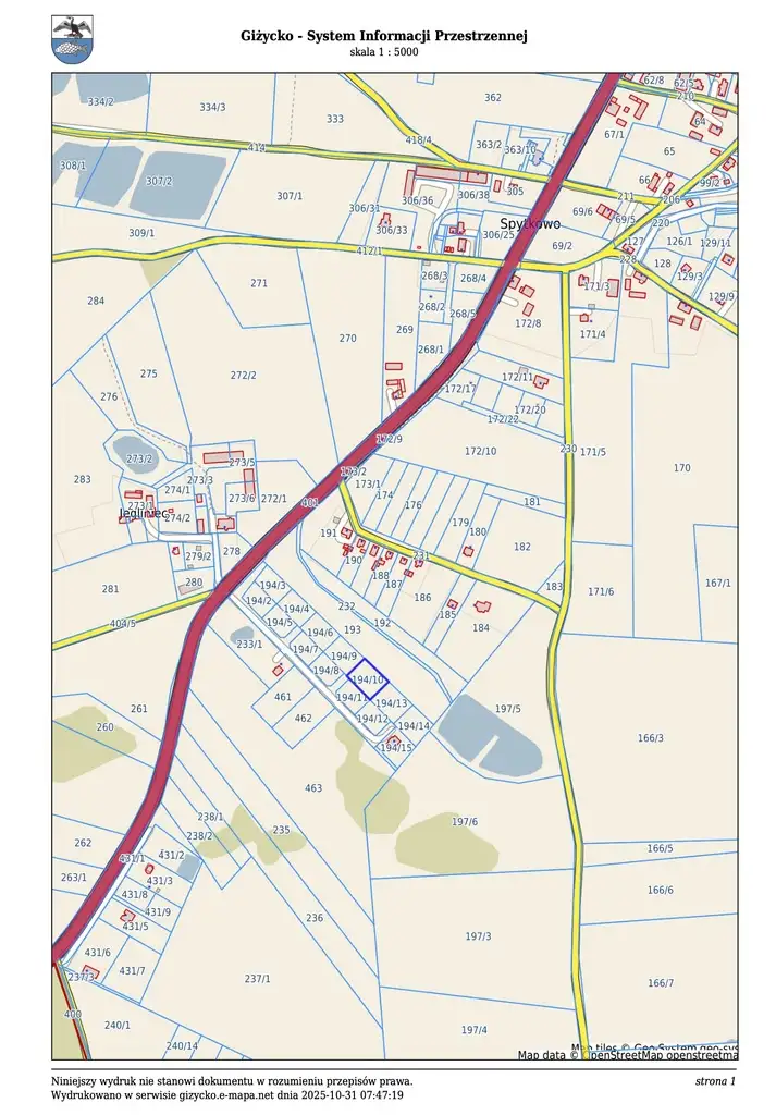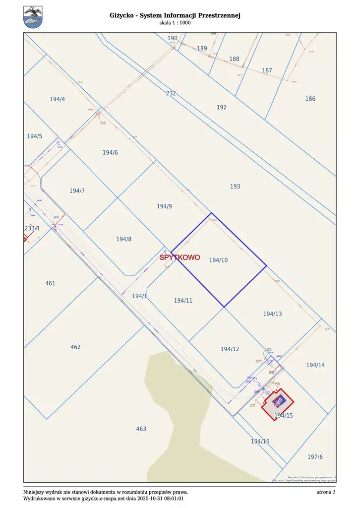 1) 194/10 o powierzchni 0,1476 ha, położona w miejscowości Spytkowo, obręb geodezyjny Spytkowo, gmina Giżycko dla której Sąd Rejonowy w Giżycku prowadzi księgę wieczystą OL1G/00017018/6. Wg ewidencji Gruntów i Budynków Starostwa Powiatowego w Giżycku działka oznaczona jest symbolem: RIVa – grunty orne.