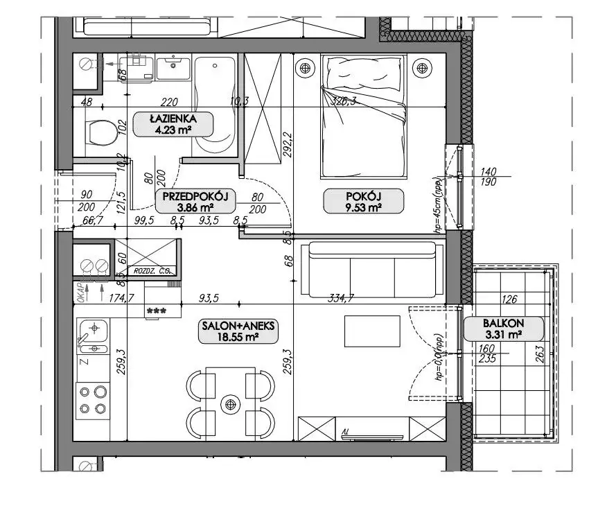 Pokój dzienny z aneksem kuchennym o pow. 18,55 m² z wyjściem na balkon o pow. 3,31 m²