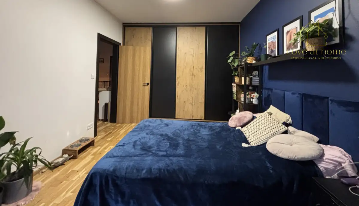- Pierwsza sypialnia stylowa i przytulna przestrzeń , urządzona w ciemnych , eleganckich barwach z akcentem granatowej ściany.