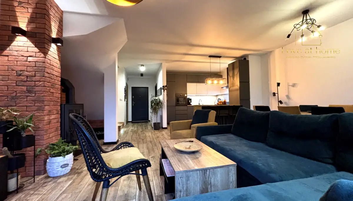 - Przestronny salon z aneksem kuchennym, z którego prowadzi wyjście na taras i do ogródka - idealne miejsce na relaks i spotkania z bliskimi.