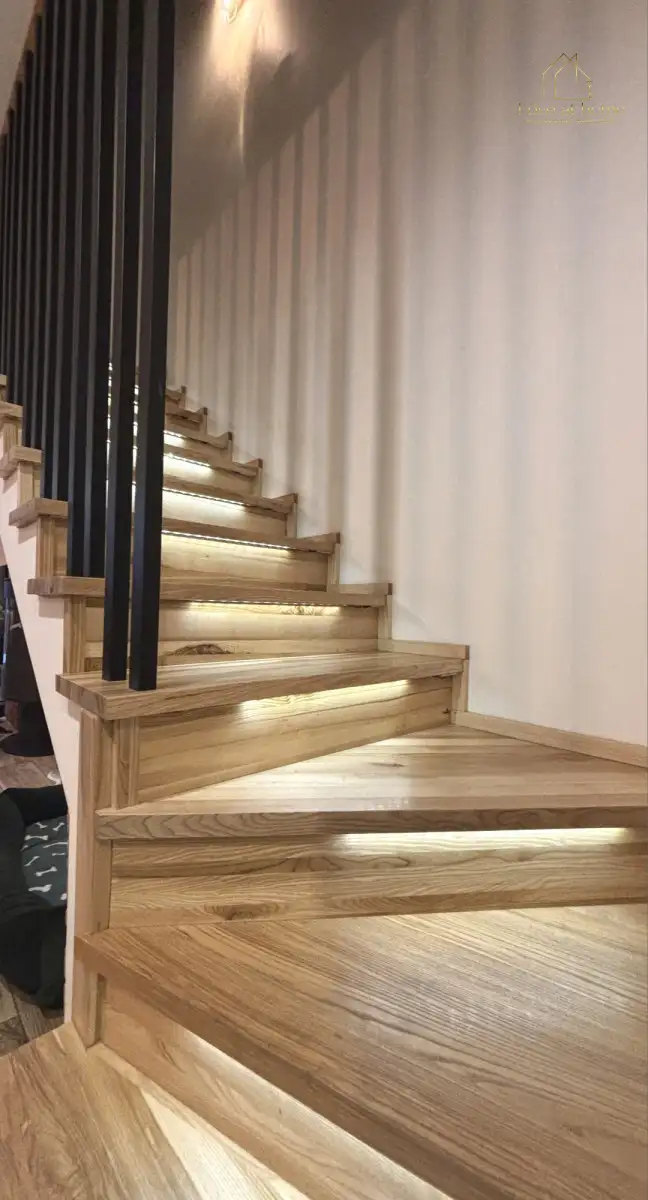 - Piękne, jasne drewniane i podświetlane schody prowadzące na piętro mieszkania.