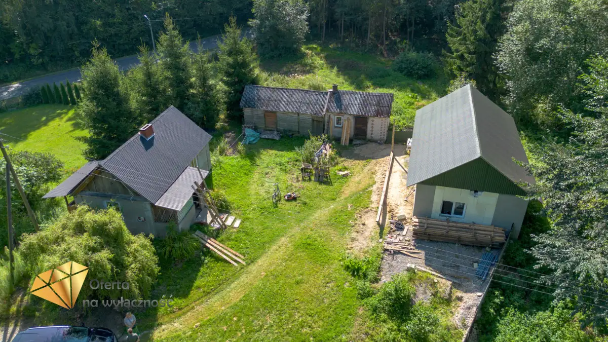 1) dom drewniany o pow. ok. 50m² z lat 50-ątych (kuchnia, dwa pokoje, łazienka), ocieplony z wymienionym dachem i oknami, który wymaga dalszego remontu lub wyburzenia w zależności od dalszego przeznaczenia nieruchomości.