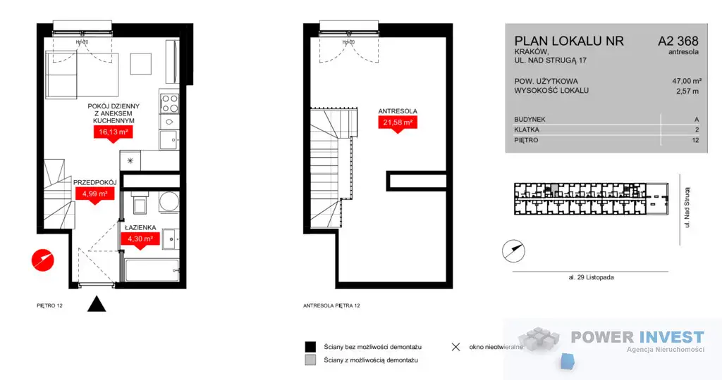 Mieszkanie znajduje się na 12 piętrze. Lokal ma powierzchnię 47,0 m² i składa się z:
