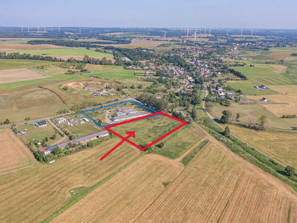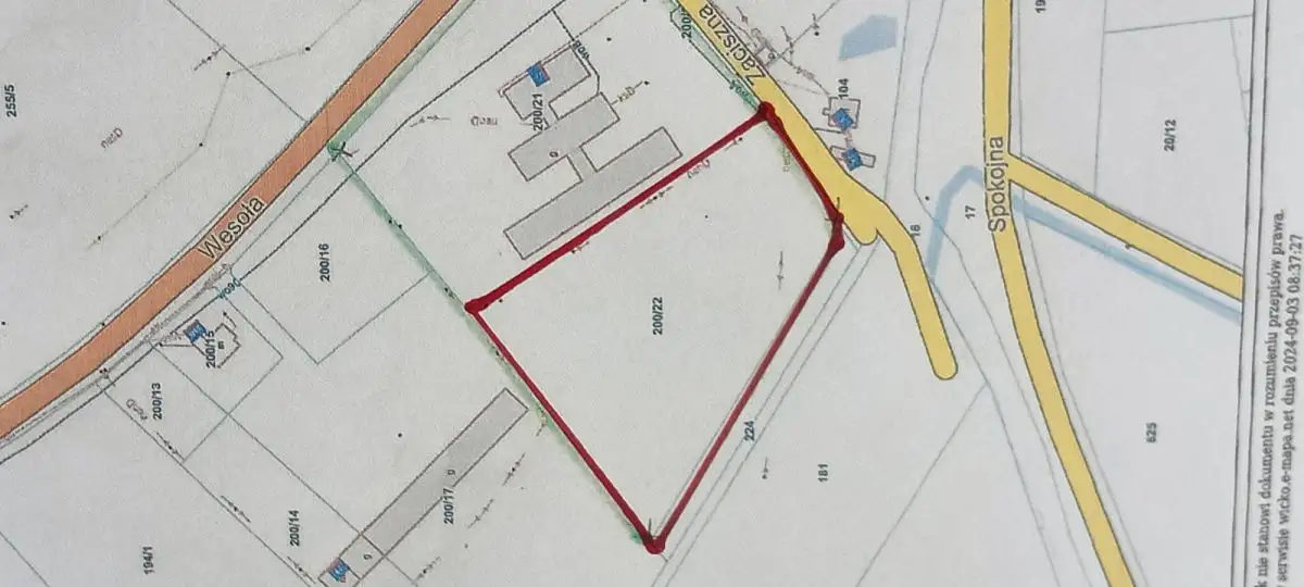 Kształt działki to trapez prostokątny, teren równy, na części działki znajdują się 3 budynki gospodarczo-usługowe, teren prowizorycznie ogrodzony.