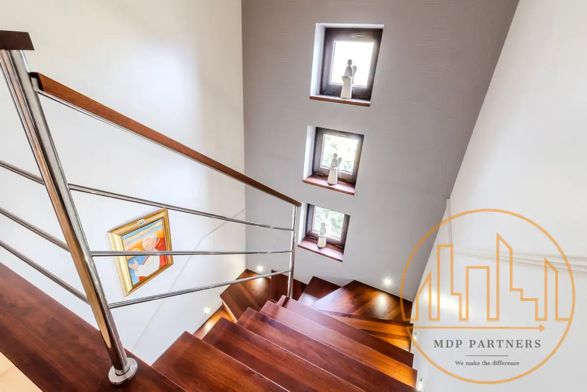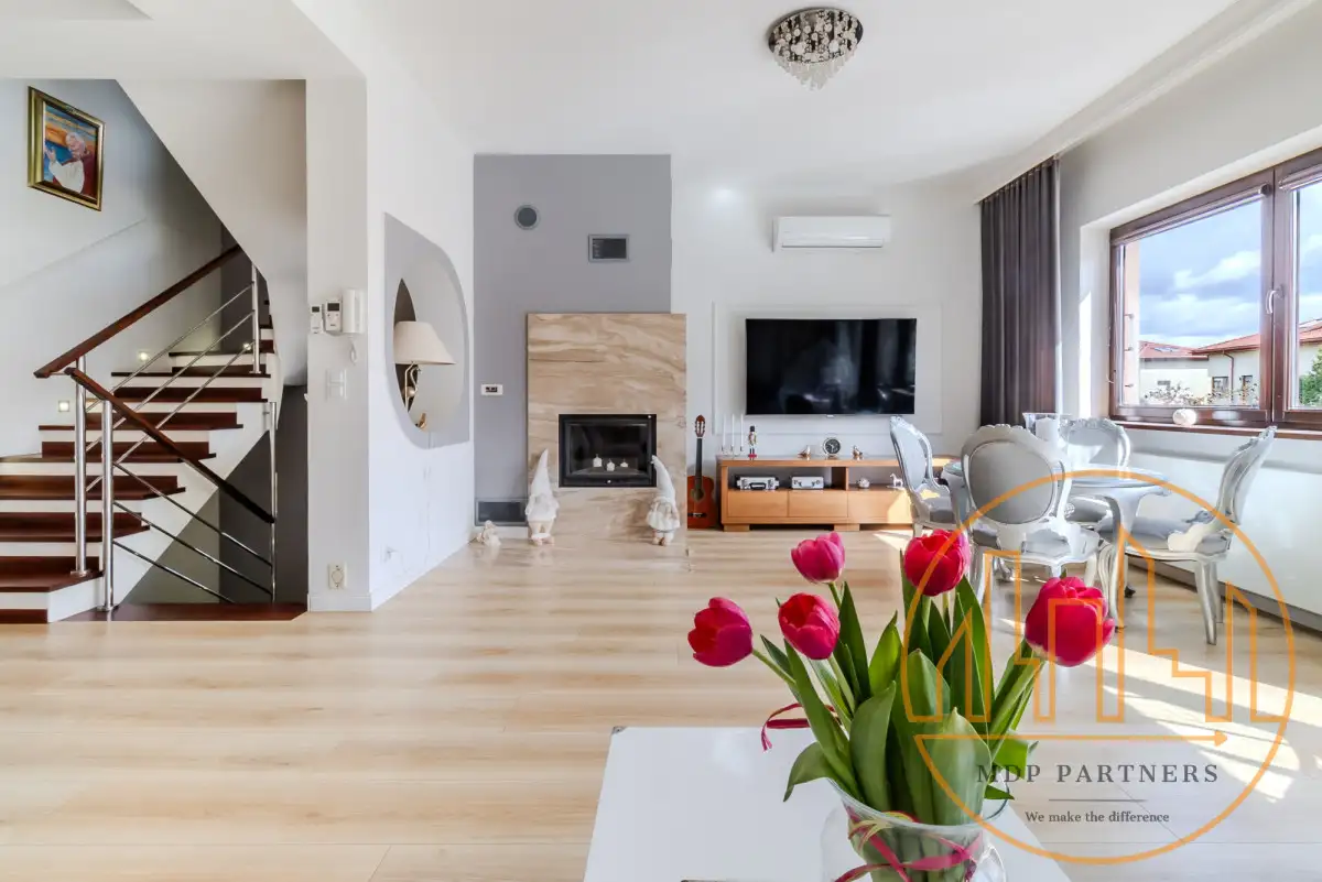 I piętro:-Salon o powierzchni ok. 35 m² z klimatycznym kominkiem i wbudowanym akwarium, wyjście na słoneczny balkon (ekspozycja południowa)