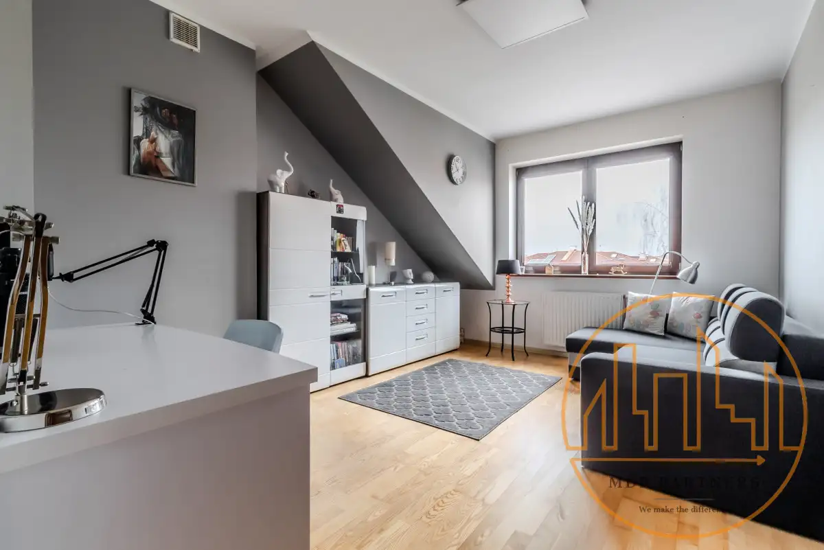 Poddasze:-Ocieplony strych (ok. 60 m²) z możliwością adaptacji na dodatkowy pokój, antresolę lub domowe kino
