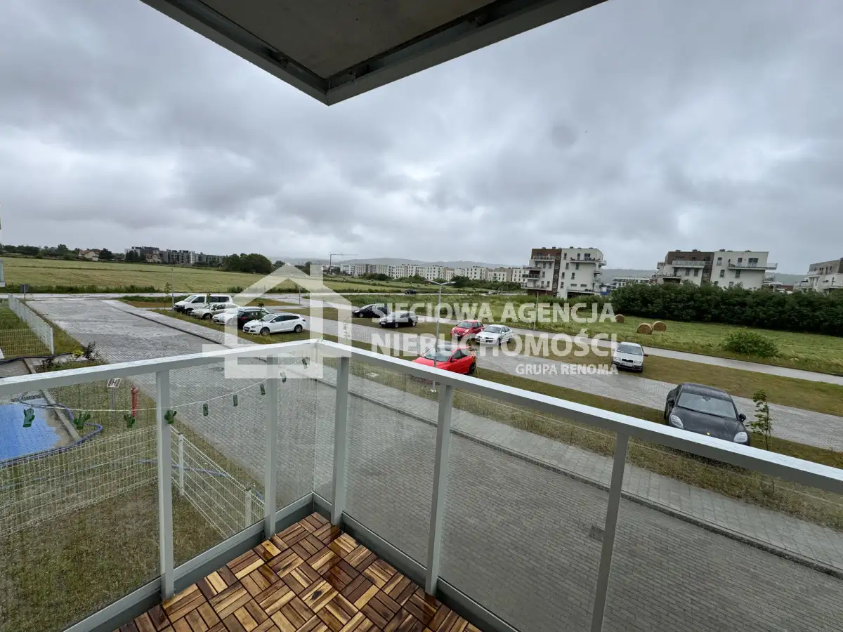 Z salonu wyjście na balkon a z niego widok na zieleń i miasto.
