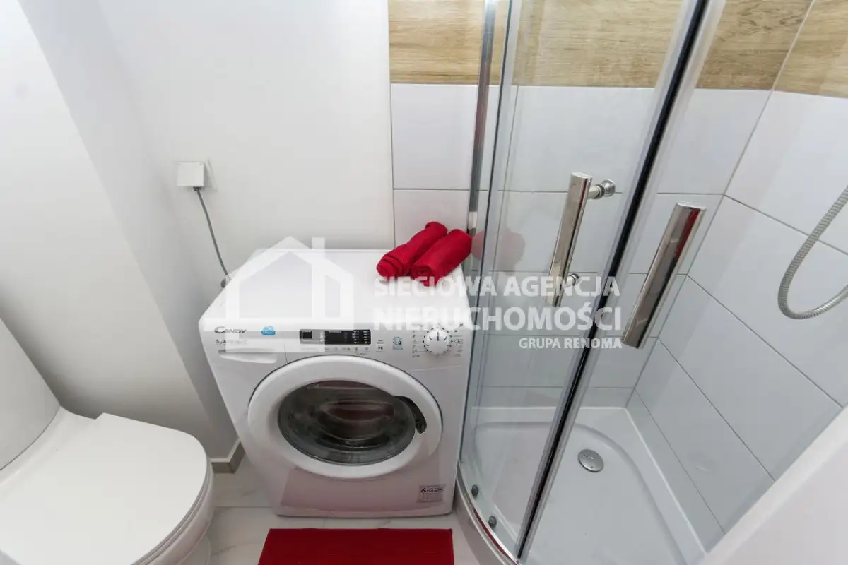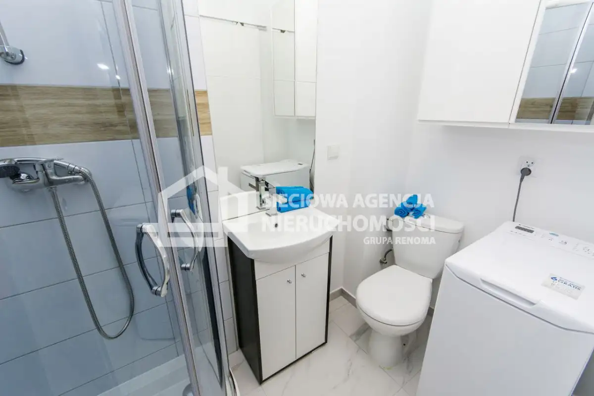 Łazienka: kabina prysznicowa, szafka z umywalką, pralka,