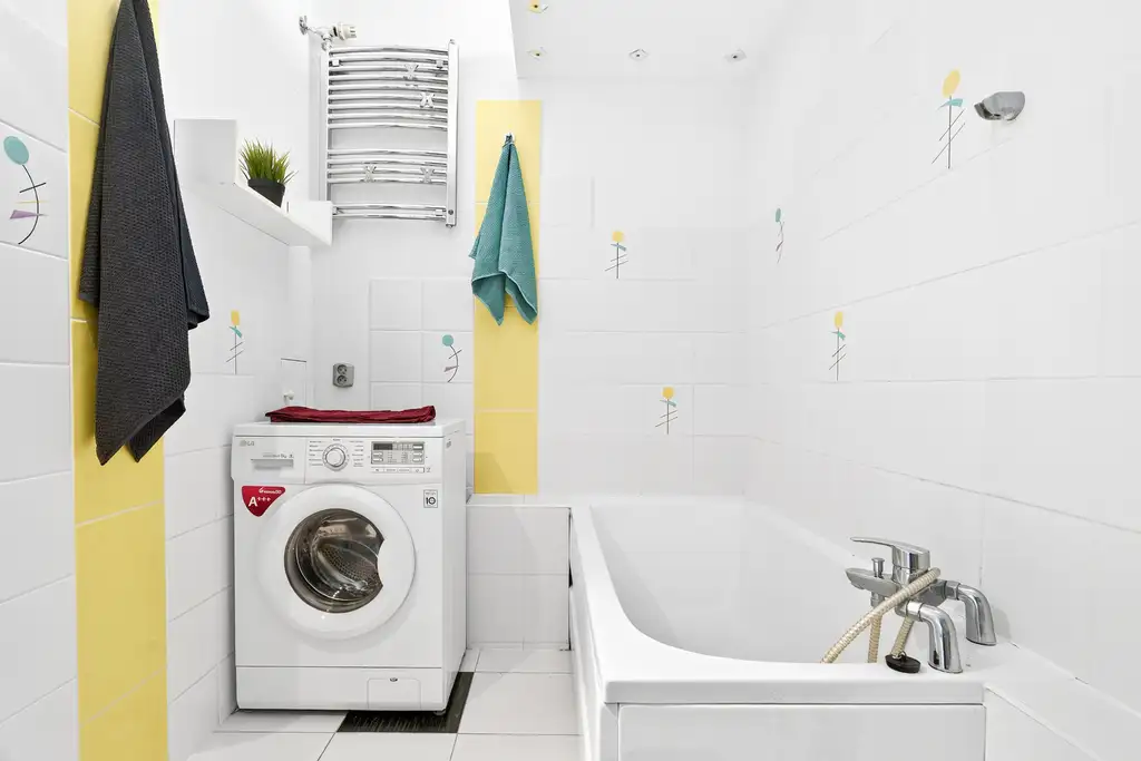 Łazienka z wanną (ok. 5 m²) – wykończona glazurą i terakotą, z wanną i pralką