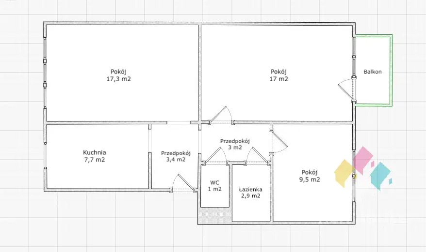 - 3 oddzielne pokoje (9,5 m², 17 m², 17,3 m²)