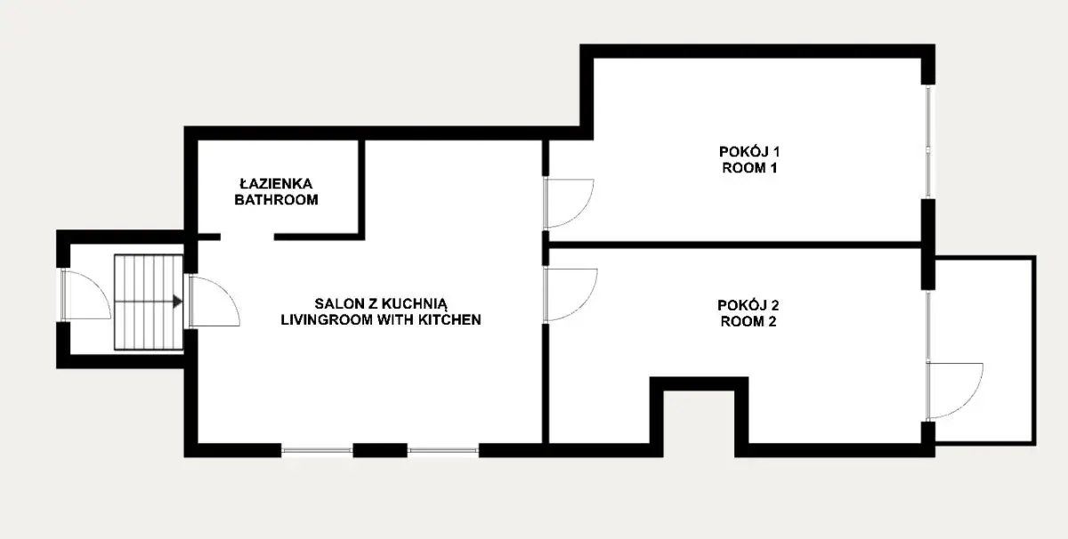 Pokoje: Salon z kuchnią, dwa oddzielne pokoje, łazienka