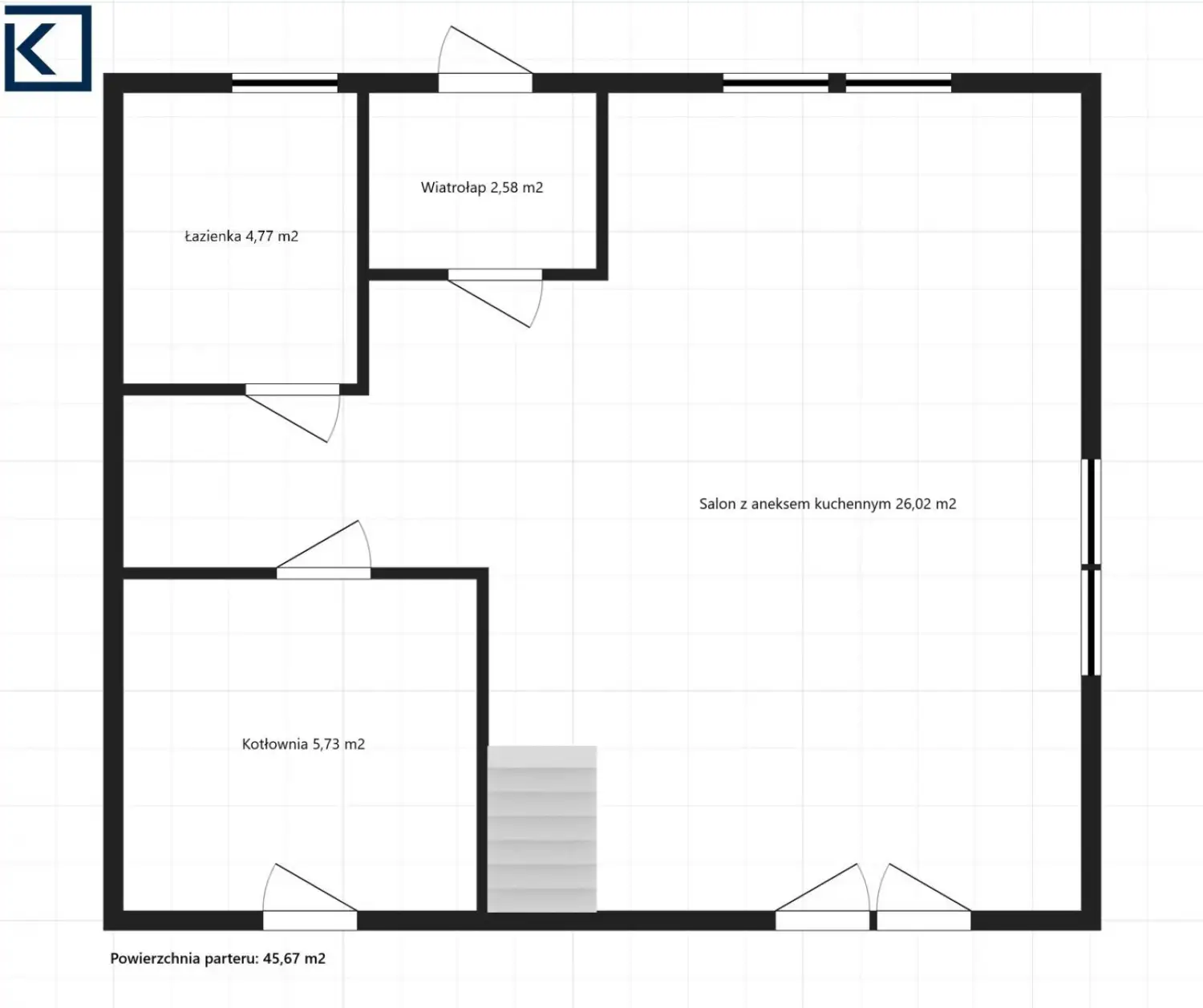 Parter: salon z aneksem kuchennym, przedpokój, kotłownia, łazienka z wc.