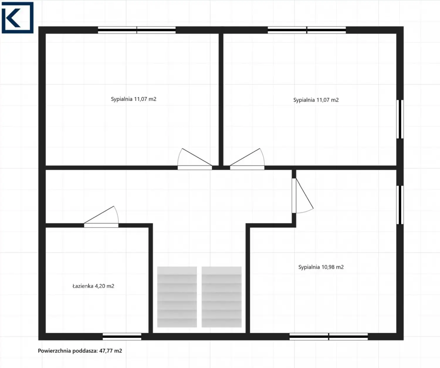 Poddasze użytkowe: 3 sypialnie, korytarz, łazienka.