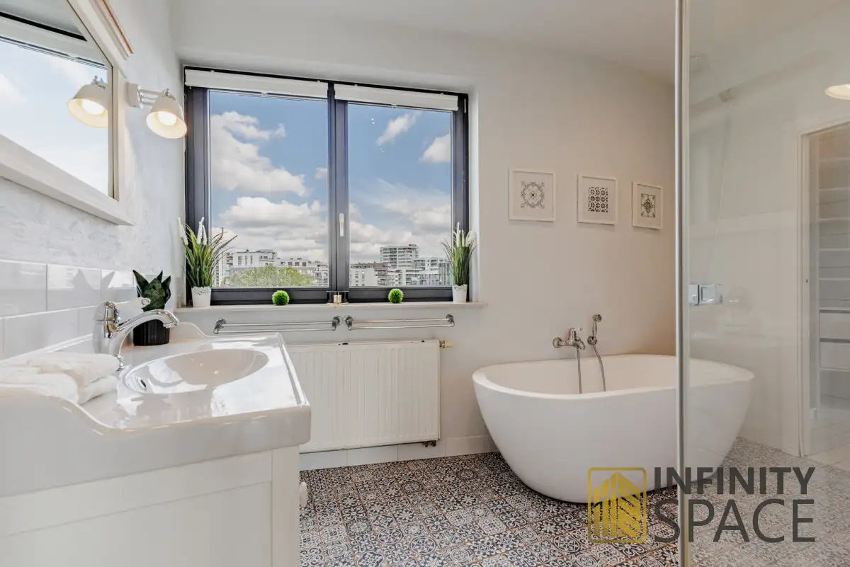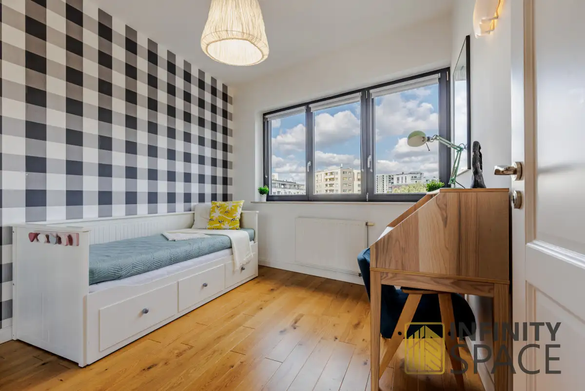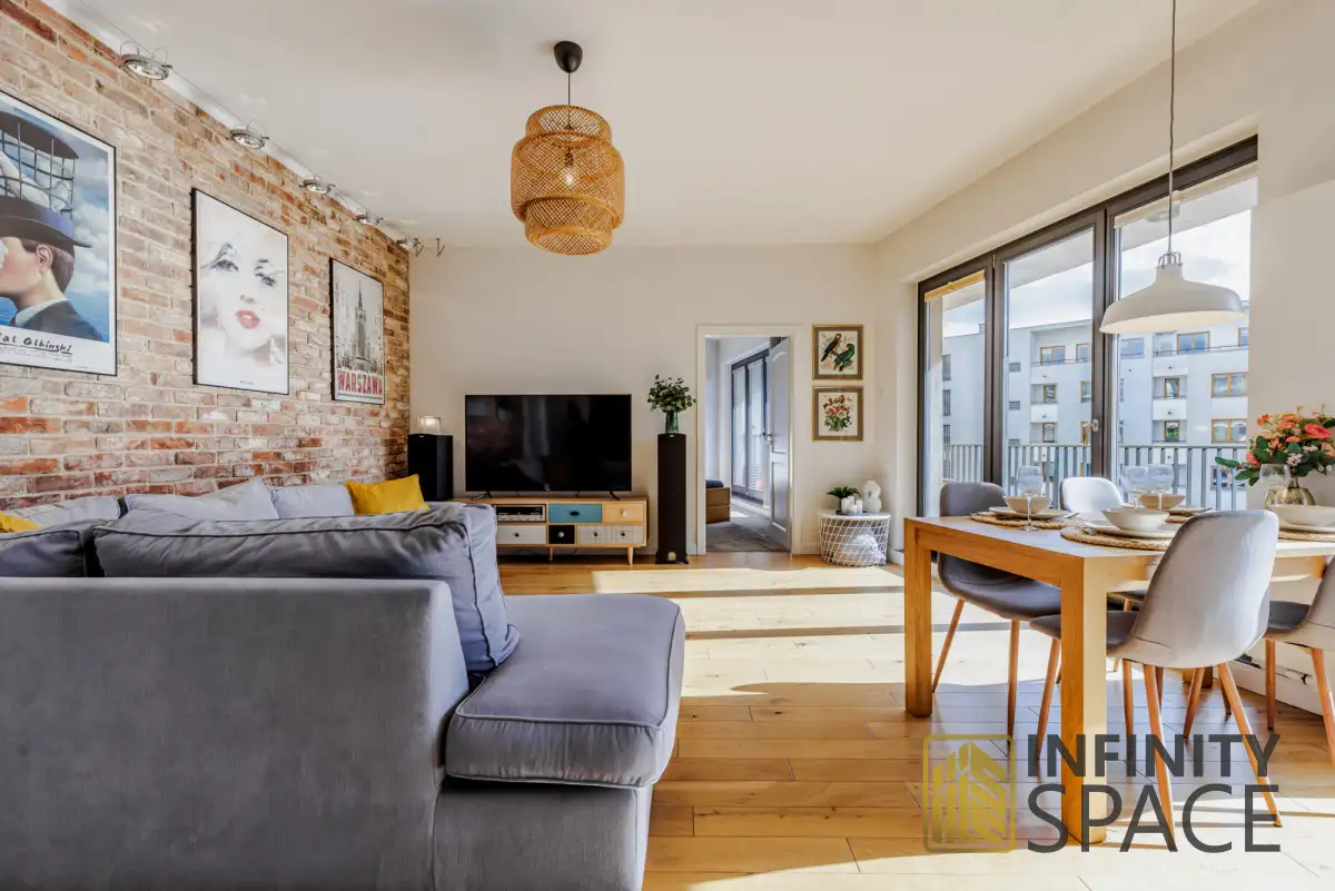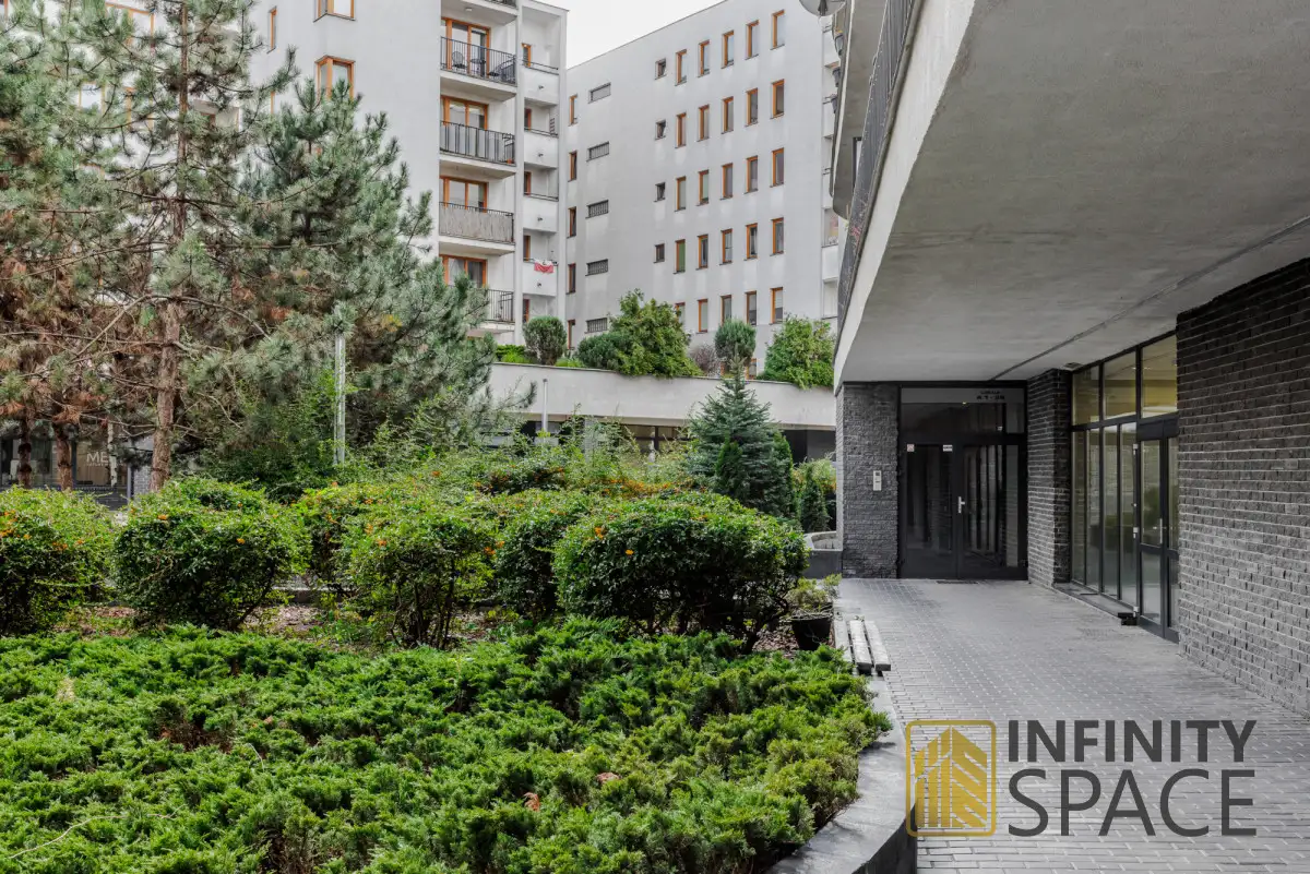 The flat is located in a lively but quiet neighbourhood at the junction of Śródmieście, Wola and Żoliborz in the immediate vicinity of the Arkadia Shopping Centre. It is well communicated (tram lines 1, 6, 17, 22, 24, 27, 28, 33, 35, 78, bus lines 180, 409, N41 and N91). Very fast access (3 stops) to the metro station Dworzec Gdański and (8 stops) to the Central Station. Only 4 minutes on foot to the Warszawa Powązki railway station. Nearby there are schools, kindergartens, crèches and numerous shops and service points.