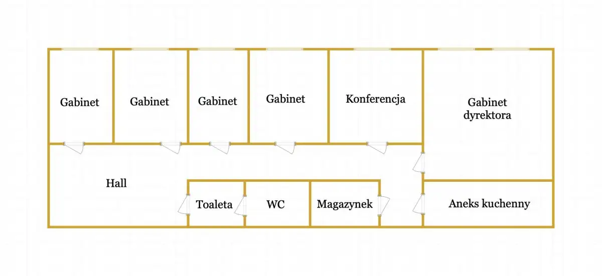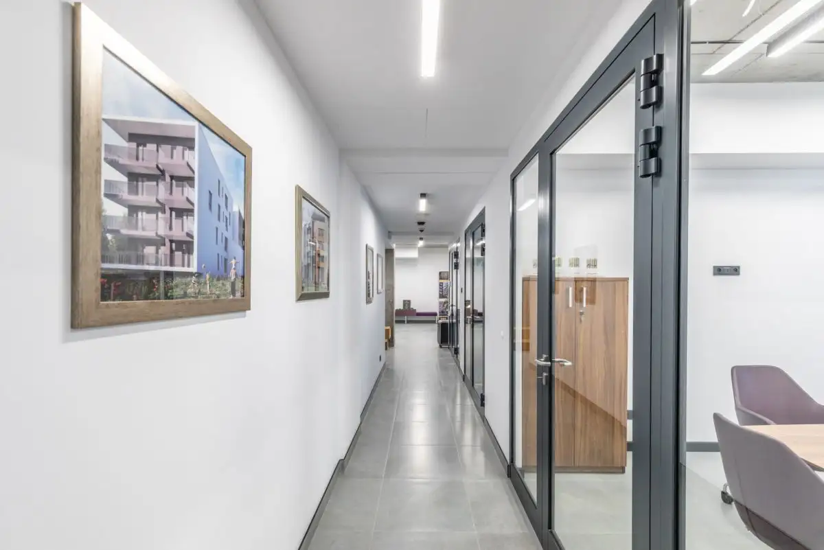- Funkcjonalny układ: 6 gabinetów, sala konferencyjna, aneks kuchenny, przestronny hall, toaleta i magazynek.