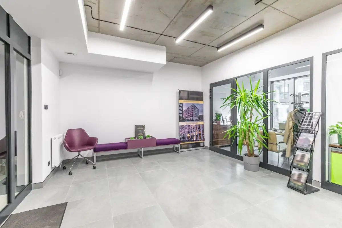 - Wysoki standard: Wykończenie w stylu loftowym, aluminiowe okna oraz gres na podłogach podkreślają nowoczesny i profesjonalny charakter przestrzeni.