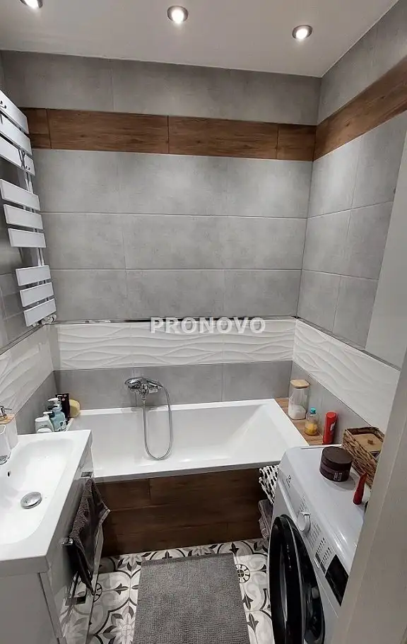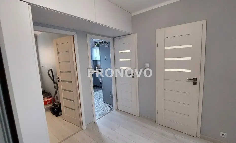 Okna są PCV z wystawą na płn-wsch (sypialnia, kuchnia), płd-zach (salon, sypialnia). Wszystkie okna i balkon zabezpieczone roletami antywłamaniowymi. Ściany gładzone i malowane, w łazience i WC nowa glazura. Podłogi w pokojach i holu z nowych paneli, w kuchni nowoczesna wykładzina PCV, w łazience i WC- terakota. Łazienka z wanną, sedesem, umywalką. W kuchni zabudowa na wymiar i sprzęt AGD w tym zmywarka. W sypialniach i holu zabudowy stałem. Możliwość pozostawienia wyposażenia ruchomego według osobnych uzgodnień.