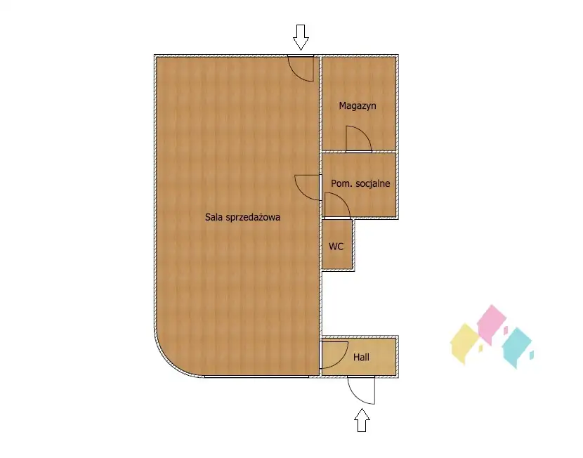 Rozkład pomieszczeń: sala sprzedażowa 68,5 m², magazyn 7 m², pomieszczenie socjalne 5 m² oraz WC 1,5 m².