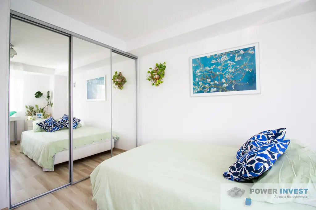 W każdym z pokoi oraz przedpokoju znajduje się duża i bardzo pojemna, przesuwna szafa z lustrem.