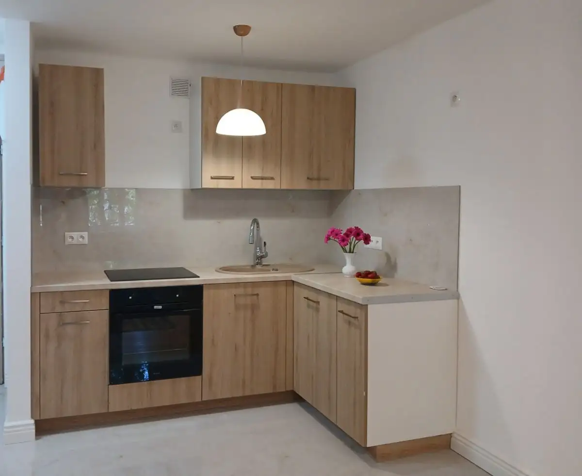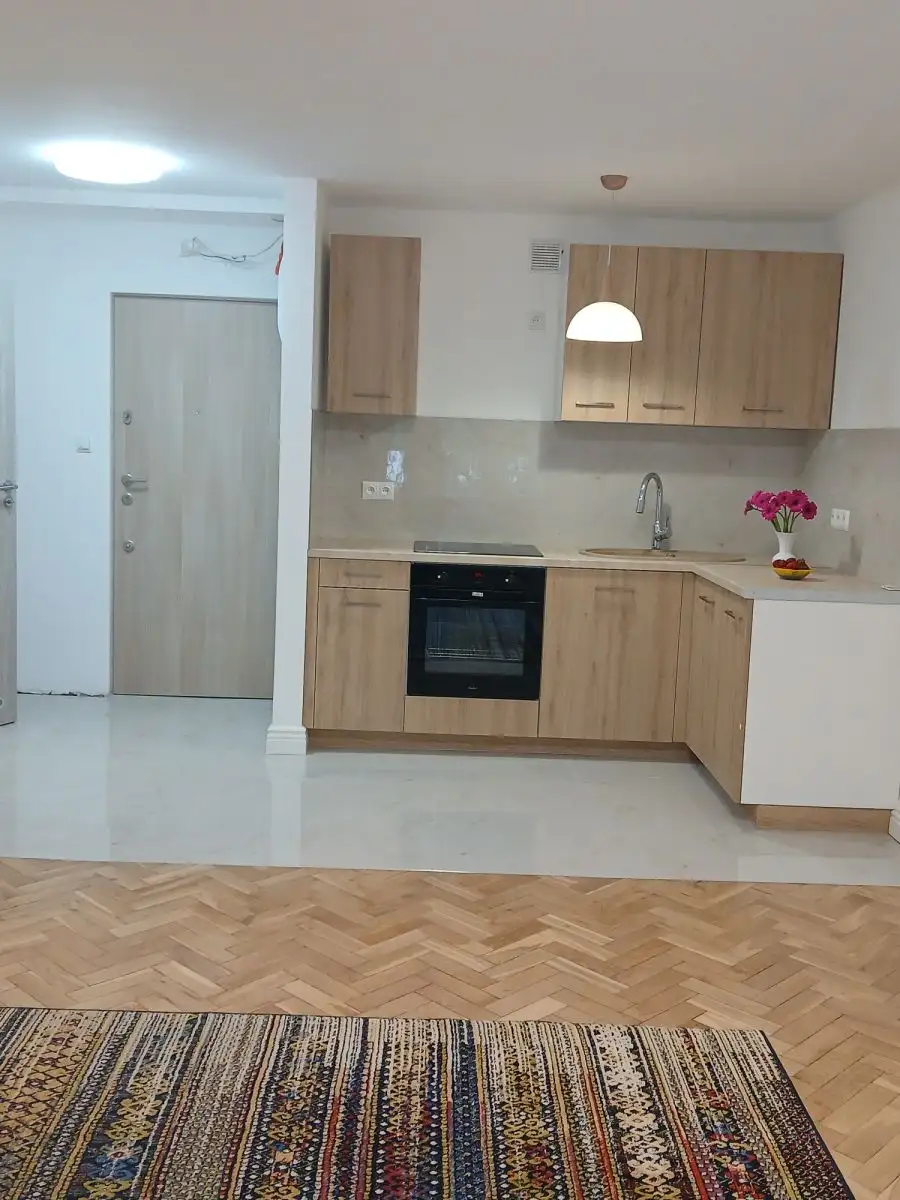Na podłogach parkiet, w kuchni i łazience gres polerowany. Aneks kuchenny wyposażony w nowy zestaw mebli, zlew z baterią, kuchenkę indukcyjną z piekarnikiem - pozostawione miejsce na lodówkę.